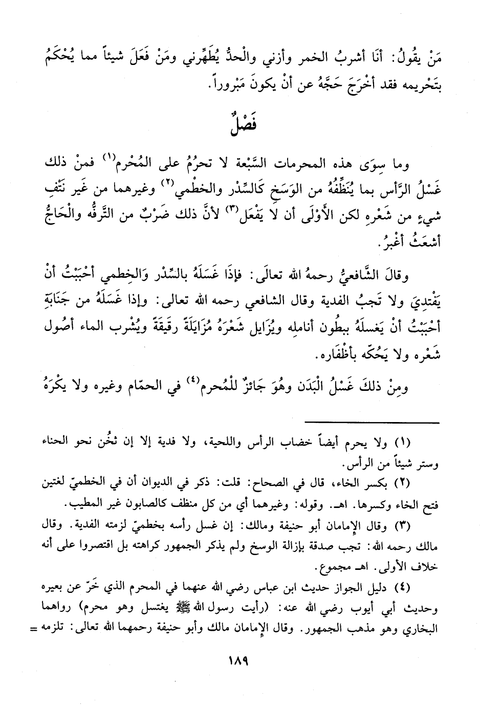 (¬3) وقال الإِمامان أبو حنيفة ومالك: إن غسل رأسه بخطمي لزمته الفدية. وقال مالك رحمه الله: تجب صدقة بإزالة الوسخ ولم يذكر الجمهور كراهته بل اقتصروا على أنه خلاف الأولى. اهـ مجموع.