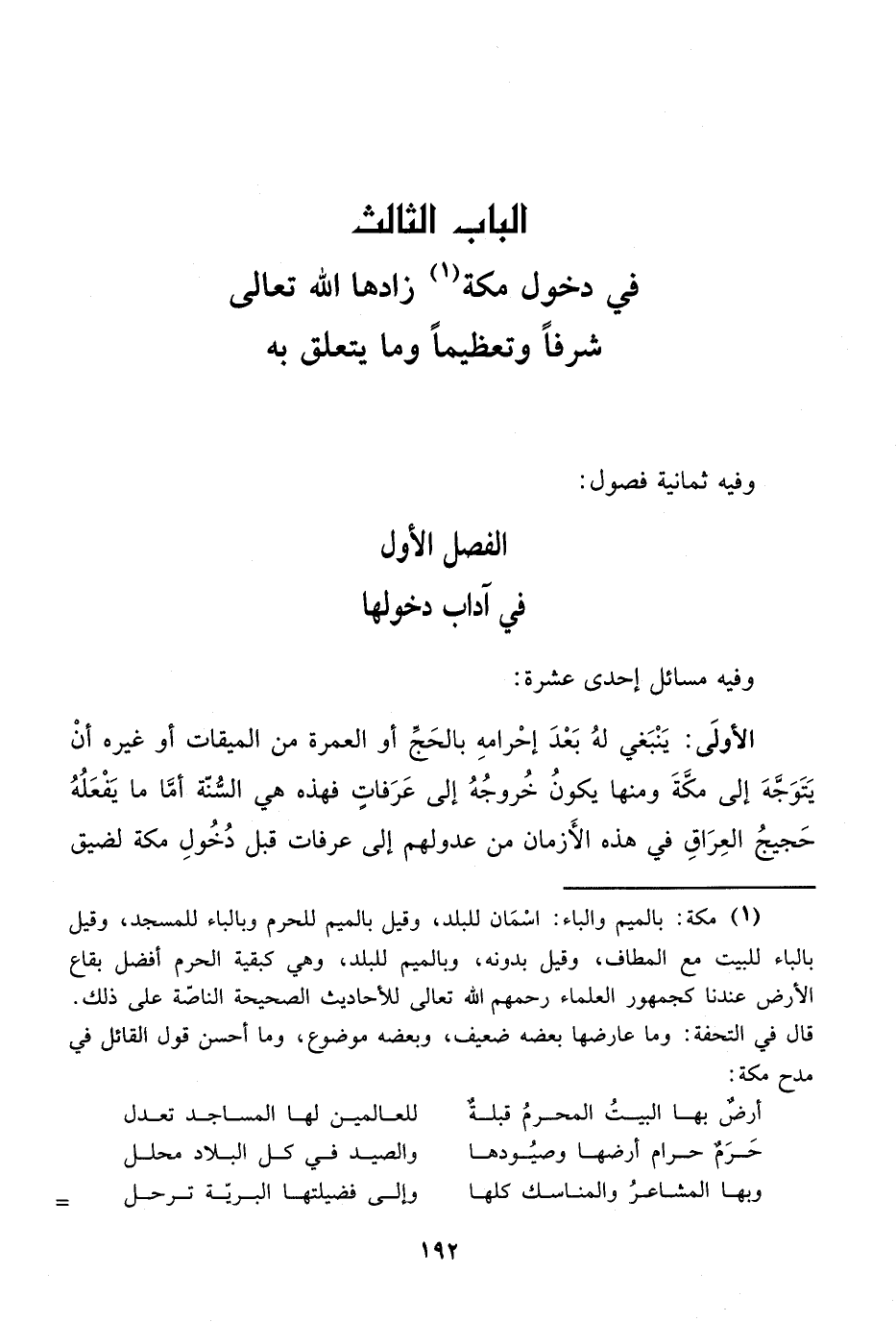 (¬1) مكة: بالميم والباء: اسْمَان للبلد، وقيل بالميم للحرم وبالباء للمسجد، وقيل بالباء للبيت مع المطاف، وقيل بدونه، وبالميم للبلد، وهي كبقية الحرم أفضل بقاع الأرض عندنا كجمهور العلماء رحمهم الله تعالى للأحاديث الصحيحة الناصة على ذلك.