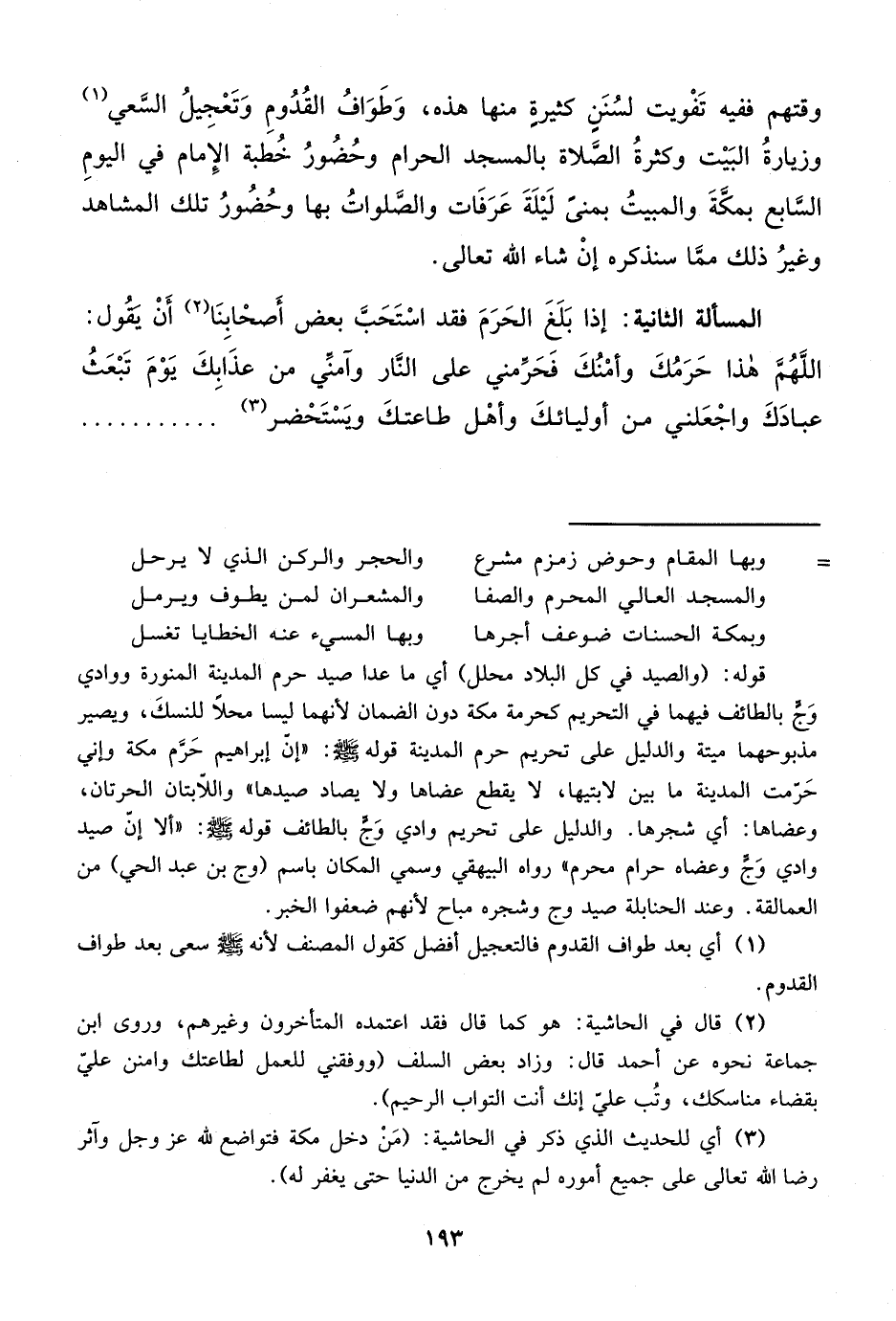 المسألة الثانية: إذا بَلَغَ الحَرَمَ فقد اسْتَحَبَّ بعض أَصحْابِنَا (¬2) أَنْ تقُول: اللَهُمَّ هذا حَرَمُكَ وأمْنُكَ فحَرمني على النَّار وآمني من عذَابِكَ يَوْمَ تَبْعَثُ عبادَكَ واجْعَلني من أوليائكَ وأهْل طاعتكَ ويَسْتَحْضر (¬3)