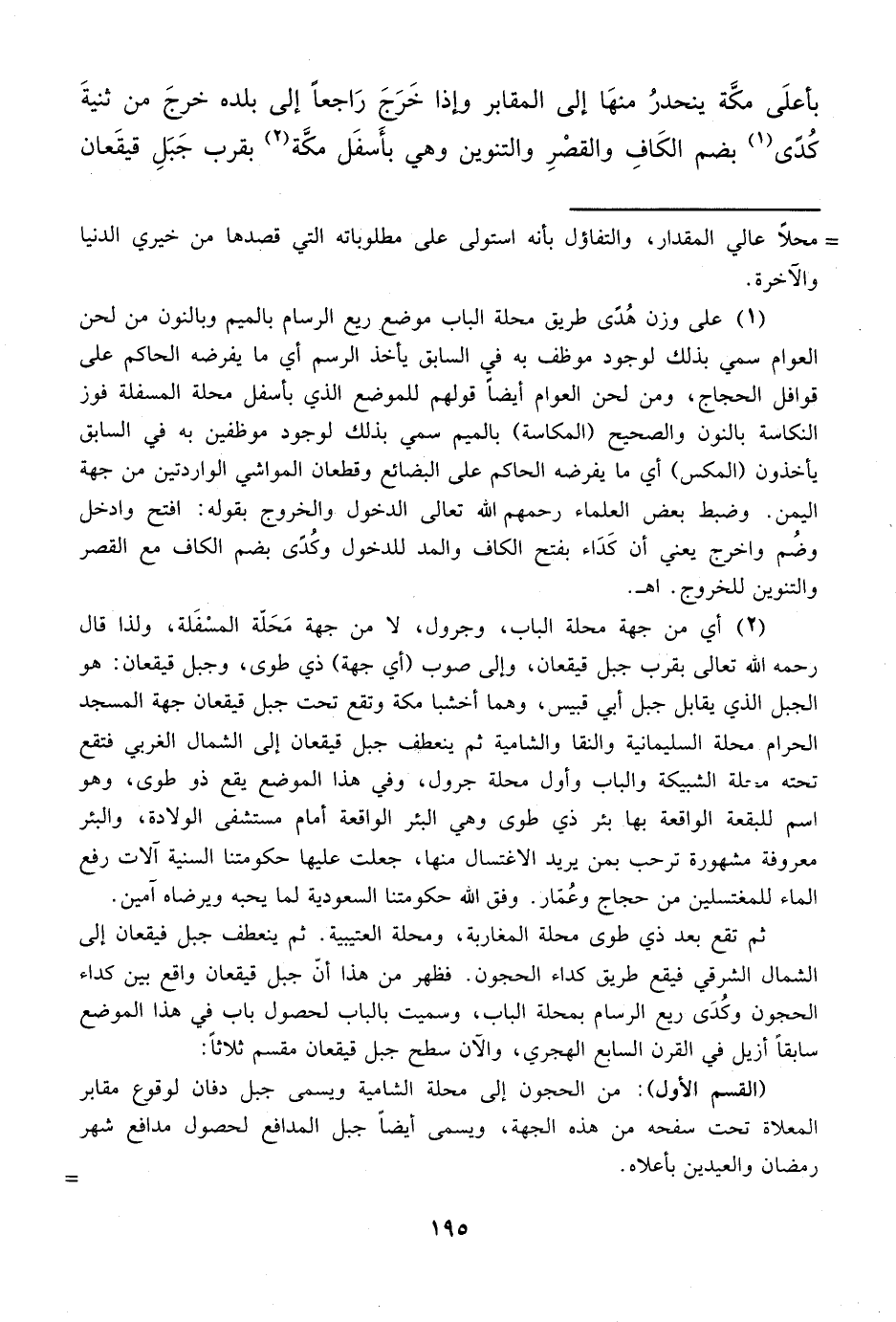 (¬2) أي من جهة محلة الباب، وجرول، لا من جهة مَحَلة المسْفَلة، ولذا قال رحمه الله تعالى بقرب جبل قيقعان، وإلى صوب (أي جهة) ذي طوى، وجبل قيقعان: هو الجبل الذي يقابل جبل أبي قبيس، وهما أخشبا مكة وتقع تحت جبل قيقعان جهة المسجد الحرام محلة السليمانية والنقا والشامية ثم ينعطف جبل قيقعان إلى الشمال الغربي فتقع تحته محلة الشبيكة والباب وأول محلة جرول، وفي هذا الموضع يقع ذو طوى، وهو اسم للبقعة الواقعة بها بئر ذي طوى وهي البئر الواقعة أمام مستشفى الولادة، والبئر معروفة مشهورة ترحب بمن يريد الاغتسال منها، جعلت عليها حكومتنا السنية آلات رفع الماء للمغتسلين من حجاج وعُمار. وفق الله حكومتنا السعودية لما يحبه ويرضاه آمين.