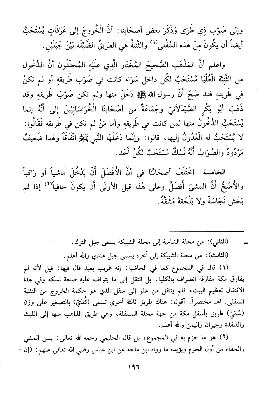 واعلم أنَّ المَذْهَب الصَّحيحَ المُخْتَار الَّذِي علَيْهِ المُحقّقُون أنَّ الدُّخُول من الثَّنِيَّة الْعُلْيَا مُسْتَحَبٌ لكُل داخل سَوَاء كانت في صَوْب طَريقهِ أو لم تكنْ في طَريقهِ فقد صَحّ أَنّ رسول الله - صلى الله عليه وسلم - دَخَلَ منها ولم تكن صَوْبَ طَريقهِ وقد ذَهَبَ أبُو بَكْر الصَّيْدَلاَنيّ وجَمَاعَة من أصْحَابنَا الْخُرَاسَانِيِّينَ إلى أنَّهُ إنما يُسْتَحَبُّ الدُّخُولُ منها لمن كانت في طَريقهِ وأما مَنْ لم تكن في طَريقه فَقَالُوا: لا يُسْتَحَبُّ له الْعُدُولُ إليها، قالوا: وإنَّما دَخَلَهَا النَبي - صلى الله عليه وسلم - اتْفَاقَاً وهذا ضَعيفٌ مَرْدُود والصَّوَابُ أَنهُ نُسُكٌ مُسْتَحَبٌ لكُلِّ أَحَد.