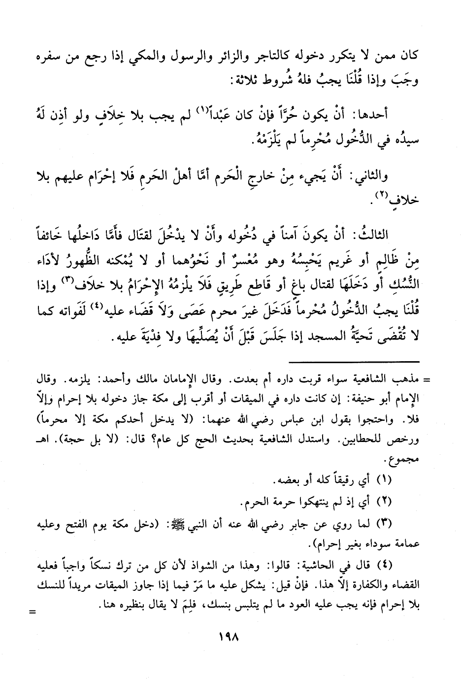 الثالثُ: أنْ يكونَ آمناً في دُخُوله وأَنْ لا يدْخُلَ لقتَال فأَمَّا دَاخلُها خَائفاً مِنْ ظَالِم أو غَريم يَحْبِسُهُ وهو مُعْسر أو نَحْوُهما أو لا يُمْكنه الظُّهورُ لأداء النُّسُكِ أو دَخَلَهَا لقتال باغ أْو قَاطع طَرِيقٍ فَلاَ يلْزمُهُ الإِحْرَامُ بلا خلاَف (¬3) وإذا قُلْنَا يجبُ الدُّخُولُ مُحْرماً فَدَخَلَ غيرَ محرم عَصَى وَلاَ قَضَاء عليه (¬4) لَفَواته كما لا تُقْضَى تَحيَّةُ المسجد إذا جَلَسَ قَبْلَ أَنْ يُصَليهَا ولا فِدْيةَ عليه.