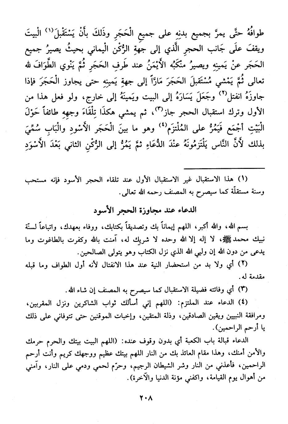 طوافه حتى يمر بجميع بدنِهِ على جميعِ الْحَجَرِ وذَلكَ بأَنْ يَسْتَقْبلَ (¬1) الْبيتَ ويقف علَى جَانب الحجرِ الذي إلى جهةِ الرُّكْن الْيماني بحيثُ يصيرُ جميع الحجر عنْ يَمينِهِ ويصيرُ منكبُه الأَيْمَنُ عند طَرفِ الحَجَرِ ثُم يَنْوي الطَّوَافَ لله تعالى ثُم يَمْشي مُسْتَقبلَ الحَجَرَ مَارَّاً إلى جهةِ يَمينِهِ حتى يجاوز الْحَجَر فإذا جاوزه انفتل (¬2) وجَعَلَ يَسَارَهُ إلى البيت ويَمينَهُ إلى خارج، ولو فعل هذا من الأول وترك استقبال الحجر جاز (¬3)، ثم يمشي هكذَا تِلْقَاءَ وجهِهِ طائفاً حَوْلَ البيت أجْمَع فَيَمُرُّ على المُلْتزَم (¬4) وهو ما بينَ الْحَجَر الأَسْودِ والْبَابِ سُمِّيَ بذلك لأَنَّ النَّاس يَلْتَزمُونَهُ عنْدَ الدُّعَاءِ ثم يَمُرُّ إلى الرُّكْنِ الثاني بَعْدَ الأَسْوَدِ