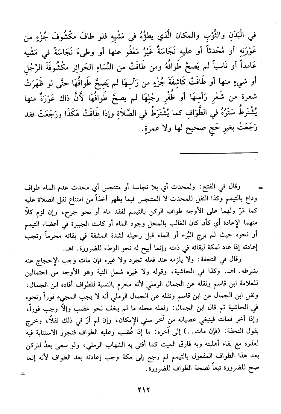في الْبَدَنِ والثوْب والمكان الَّذي يطؤُهُ في مَشْيِهِ فلو طافَ مكْشُوفَ جُزْء من عَوْرَتِه أو مُحْدثاً أو عليهِ نَجَاسَةٌ غَيْرُ مَعْفُو عنها أو وطىءَ نَجَاسَة في مَشْيه عَامداً أو نَاسياً لم يَصحَّ طَوافُهُ ومن طَافَتْ من النِّسَاءِ الحَرائِر مكْشُوفَةَ الرِّجْلِ أو شيء منها أو طَافَتْ كَاشِفَةَ جُزْء من رَأسِهَا لم يَصحَّ طَوافُهَا حتى لو ظَهَرَتْ شعرة من شَعْرِ رَأسِهَا أو ظُفْرِ رجْلِهَا لم يصحَّ طَوافُهَا لأَنَ ذاك عَوْرَةٌ منها يُشْتَرطُ سَتْرُهُ في الطَّوَافِ كما يُشْتَرَطُ في الصَّلاَةِ وإذا طَافَتْ هَكَذَا ورَجَعَتْ فقد رَجَعَتْ بغيرِ حَج صحيح لها ولا عمرة.
