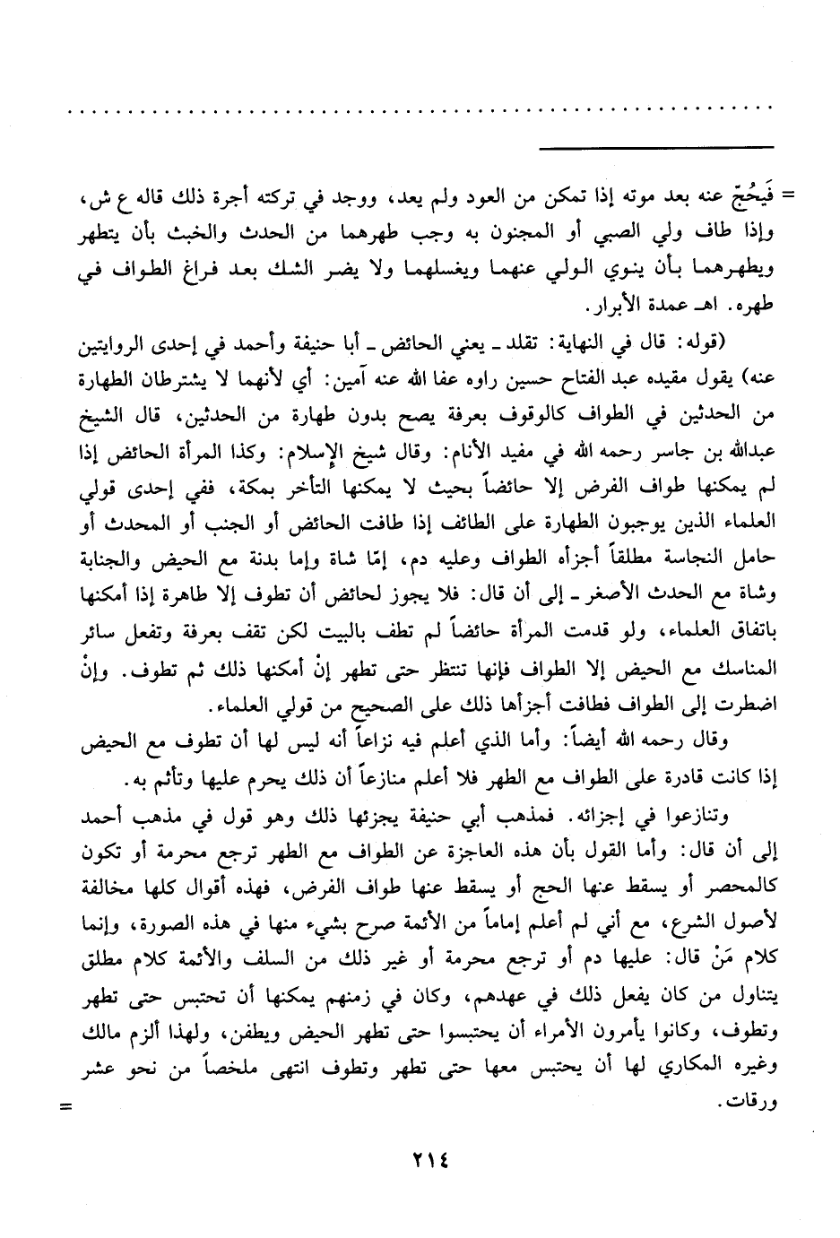 وتنازعوا في إجزائه. فمذهب أبي حنيفة يجزئها ذلك وهو قول في مذهب أحمد إلى أن قال: وأما القول بأن هذه العاجزة عن الطواف مع الطهر ترجع محرمة أو تكون كالمحصر أو يسقط عها الحج أو يسقط عنها طواف الفرض، فهذه أقوال كلها مخالفة لأصول الشرع، مع أني لم أعلم إماماً من الأئمة صرح بشيء منها في هذه الصورة، وإنما كلام مَنْ قال: عليها دم أو ترجع محرمة أو غير ذلك من السلف والأئمة كلام مطلق يتناول من كان يفعل ذلك في عهدهم، وكان في زمنهم يمكنها أن تحتبس حتى تطهر وتطوف، وكانوا يأمرون الأمراء أن يحتبسوا حتى تطهر الحيض ويطفن، ولهذا ألزم مالك وغيره المكاري لها أن يحتبس معها حتى تطهر وتطوف انتهى ملخصاً من نحو عشر ورقات. =