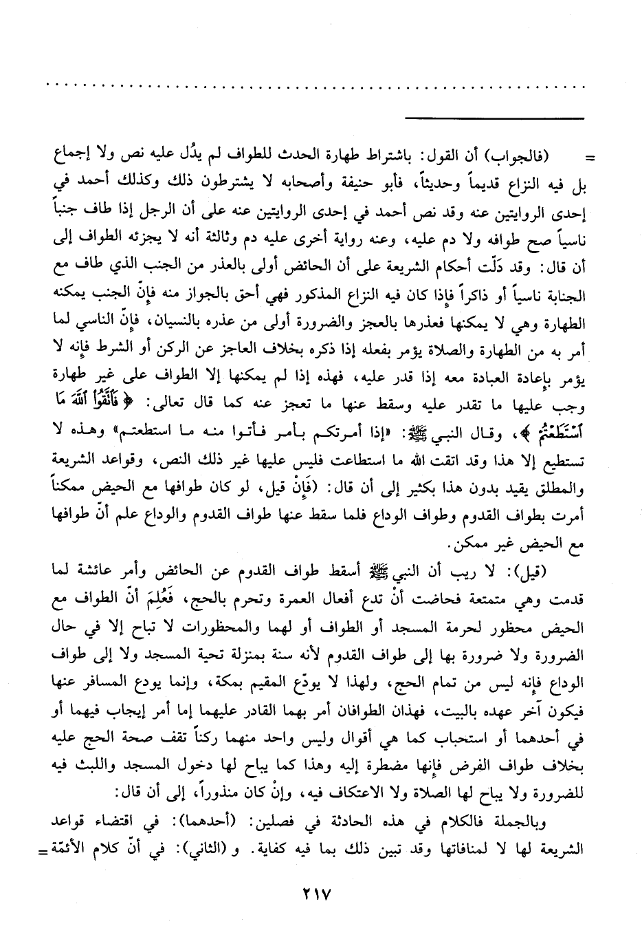 = (فالجواب) أن القول: باشتراط طهارة الحدث للطواف لم يدُل عليه نص ولا إجماع بل فيه النزاع قديماً وحديثاً، فأبو حنيفة وأصحابه لا يشترطون ذلك وكذلك أحمد في إحدى الروايتين عنه وقد نص أحمد في إحدى الروايتين عنه على أن الرجل إذا طاف جنباً ناسياً صح طوافه ولا دم عليه، وعنه رواية أخرى عليه دم وثالثة أنه لا يجزئه الطواف إلى أن قال: وقد دَلت أحكام الشريعة على أن الحائض أولى بالعذر من الجنب الذي طاف مع الجنابة ناسياً أو ذاكراً فإِذا كان فيه النزاع المذكور فهي أحق بالجواز منه فإِن الجنب يمكنه الطهارة وهي لا يمكنها فعذرها بالعجز والضرورة أولى من عذره بالنسيان، فإِن الناسي لما أمر به من الطهارة والصلاة يؤمر بفعله إذا ذكره بخلاف العاجز عن الركن أو الشرط فإِنه لا يؤمر بإِعادة العبادة معه إذا قدر عليه، فهذه إذا لم يمكنها إلا الطواف على غير طهارة وجب عليها ما تقدر عليه وسقط عنها ما تعجز عنه كما قال تعالى: {فَاتَّقُوا اللَّهَ مَا اسْتَطَعْتُمْ} [التغابن: 16]، وقال النبي - صلى الله عليه وسلم -: "إذا أمرتكم بأمر فأتوا منه ما استطعتم" وهذه لا تستطيع إلا هذا وقد اتقت الله ما استطاعت فليس عليها غير ذلك النص، وقواعد الشريعة والمطلق يقيد بدون هذا بكثير إلى أن قال: فَإِن قيل، لو كان طوافها مع الحيض ممكناً أمرت بطواف القدوم وطواف الوداع فلما سقط عنها طواف القدوم والوداع علم أن طوافها مع الحيض غير ممكن.