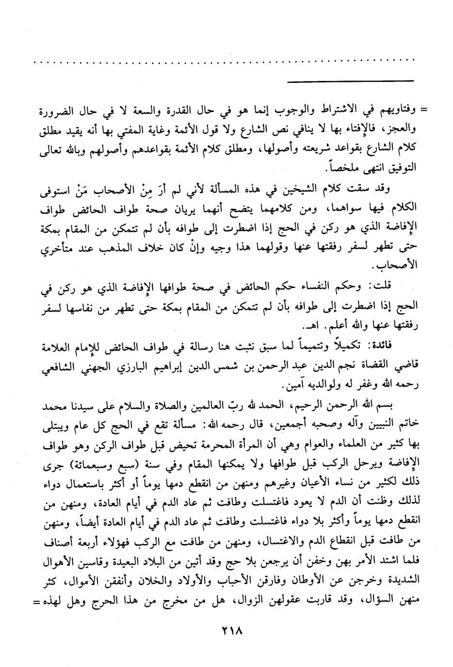 فائدة: تكميلاً وتتميماً لما سبق نثبت هنا رسالة في طواف الحائض للإمام العلامة قاضي القضاة نجم الدين عبد الرحمن بن شمس الدين إبراهيبم البارزي الجهني الشافعي رحمه الله وغفر له ولوالديه آمين.
