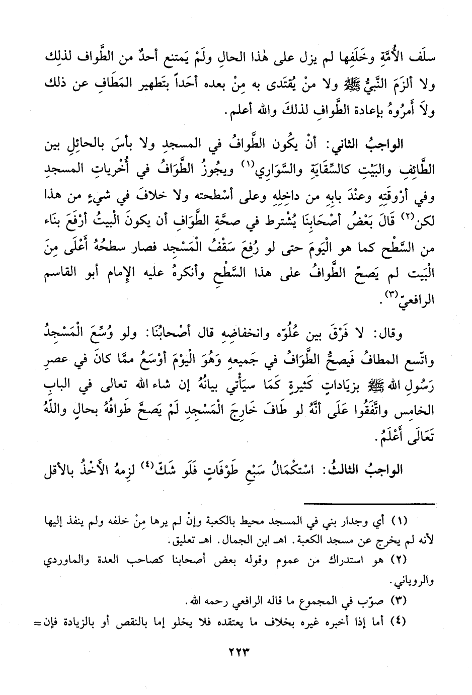 الواجبُ الثاني: أنْ يكُون الطَّوافُ في المسجدِ ولا بأسَ بالحائِلِ بين الطَائِفِ والبَيْتِ كالسقَايةِ والسَّوَارِي (¬1) ويجُوزُ الطَّوَافُ في أُخْرياتِ المسجدِ وفي أرْوقَتِهِ وعنْدَ بابِهِ من داخِلِهِ وعلى أسْطحته ولا خلافَ في شيءٍ من هذا لكن (¬2) قَالَ بَعْضُ أصْحَابِنَا يُشْترط في صحَّةِ الطَّوَافِ أن يكونَ الْبيتُ أرْفَعَ بنَاء من السَّطْح كما هو الْيَومَ حتى لو رُفع سَقْفُ الْمَسْجِد فصار سطحُهُ أَعْلَى مِنَ الْبَيت لم يَصحّ الطَّوافُ على هذا السَّطْحِ وأنكرهُ عليه الإِمام أبو القاسم الرافعيّ (¬3).