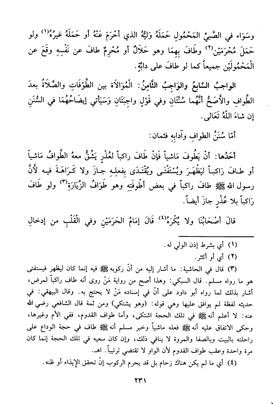 (¬3) قال في الحاشية: ما أشار إليه من أن ركوبه - صلى الله عليه وسلم - فيه إنما كان ليظهر فيستفتى هو ما رواه مسلم. قال السبكي: وهذا أصح من رواية مَنْ روى أنه طاف راكباً لمرضى، أشار بذلك لما رواه أبو داود على أن في إسناده مَنْ لا يحتج به. وقال البيهقي: في حديثه لفظة لم يوافق عليها وهي قوله: (وهو يشتكي) ومن ثمة قال الشافعي رضي الله عنه: لا أعلم أنه - صلى الله عليه وسلم - في تلك الحجة اشتكى، وأما طواف القدوم، ففي الأم وغيرها، وحكى الاتفاق عليه أنه - صلى الله عليه وسلم - فعله ماشياً وخبر مسلم أنه - صلى الله عليه وسلم - طاف في حجة الوداع على راحلته بالبيت وبالصفا والمروة لا ينافي ذلك، وإن كان سعيه في تلك الحجة إنما كان مرة واحدة وعقب طواف القدوم لأن الواو لا تقتضي ترتيباً. اهـ.