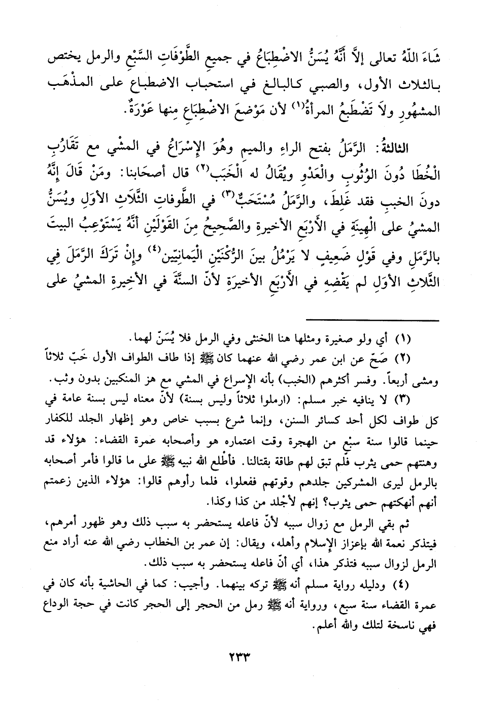 (¬2) صَح عن ابن عمر رضي الله عنهما كان - صلى الله عليه وسلم - إذا طاف الطواف الأول خب ثلاثاً ومشى أربعاً. وفسر أكثرهم (الخبب) بأنه الإِسراع في المشي مع هز المنكبين بدون وثب.