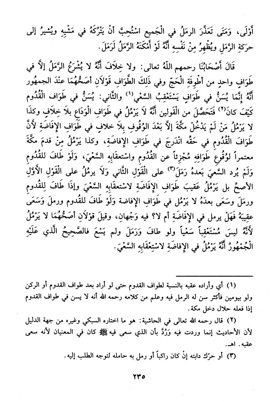 قَالَ أَصْحَابُنَا رحمهم الله تعالى: ولا خِلاَفَ أَنهُ لا يُشْرَعُ الرَّمَلُ إلاَّ في طَوَاف واحدِ من أطْوِفَةِ الْحَجّ وفي ذَلِكَ الطَّوَافِ قَوْلاَنِ أصَحُّهُمَا عنْدَ الجمهُور أنهُ إِنَّمَا يُسَنُّ في طَوَاف يَسْتَعْقِبُ السَّعْي (¬1) والثاني: يُسَنُّ في طَوَاف الْقُدُوم كَيْفَ كانَ (¬2) فَتَحَصَّلَ من الْقَولين أنهُ لاَ يَرْمُلُ في طَوَافِ الْوَدَاعِ بلاَ خِلاَفِ وكذَا لا يَرْمُلُ مَنْ لَمْ يَدْخُلْ مكَّةَ إلا بَعْدَ الوُقُوفِ بِلاَ خلافِ في طَوَافِ الإِفَاضَةِ لأَن طَوَافَ الْقُدُومِ في حَقه انْدرجَ في طَوَافِ الإِفاضَةِ، وكذا يَرْمُلُ مِنْ قدمَ مكَّةَ معتمراً لوُقُوعِ طَوَافِهِ مُجْزِئاً عن القُدُومِ واسْتعقَابِهِ السَّعْيَ، وَلَوْ طَافَ للقُدُومِ وَلَمْ يُرد السَّعيَ بَعدهُ رَمَلَ (¬3) على الْقَوْلِ الثاني وَلاَ يرمُلُ على الْقَوْلِ الأَوَّلِ الأصح بل يَرْمُلُ عَقيبَ طَوَافِ الإفَاضَةِ لاسْتعقَابِهِ السَّعْيَ وإذَا طَافَ لِلقُدومِ ورمَلَ وسَعَى بعدَهُ لا يَرْمُل في طَوَافِ الإِفاضة وَلَوْ طَافَ للقُدوم ورملَ وَسَعَى عقِيبَهُ فَهَلْ يرمل في الإِفَاضَةِ أم لا؟ فيه وَجْهانِ، وقيلَ قوْلاَنِ أصَحُّهُمَا لا يَرْمُلُ لأَنَّهُ ليسَ مُسْتَعْقِباً سَعْياً ولو طافَ وَرَمَلَ ولم يَسْعَ فالصَّحِيحُ الَّذي عَلَيْهِ الْجُمْهُورُ أنهُ يَرْمُلُ في الإِفاضَةِ لاسْتِعْقَابِهِ السَّعْيَ.