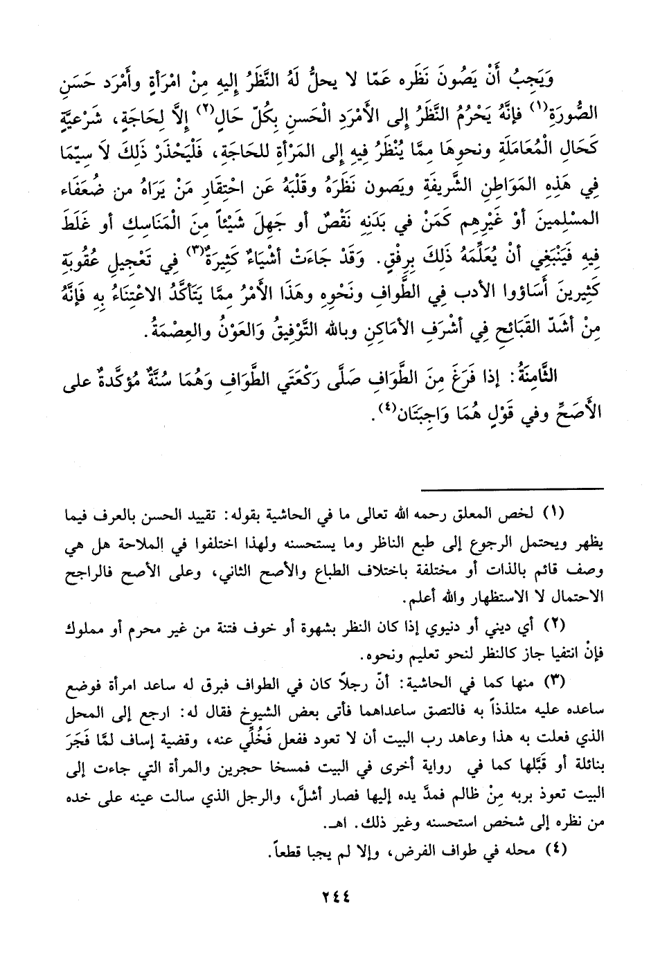 وَيَجبُ أَنْ يَصُونَ نَظَره عَمّا لا يحلُّ لَهُ النَّظَرُ إِليهِ مِنْ امْرَأة وأَمْرَد حَسَنِ الصُّورَةِ (¬1) فإنَّهُ يَحْرُمُ النظَرُ إِلى الأَمْرَدِ الْحَسنِ بكُلّ حَال (¬2) إِلاَّ لِحَاجَة، شَرْعية كَحَالِ الْمُعَامَلَةِ ونحوِهَا مِمَّا يُنْظَرُ فِيهِ إِلى المَرْأةِ للحَاجَةِ، فَلْيَحْذَرْ ذَلِكَ لاَ سِيّمَا فِي هَذه المَوَاطِنِ الشَّريفَةِ ويَصون نَظَرَهُ وقَلْبَهُ عَن احْتِقَارِ مَنْ يَرَاهُ من ضُعَفَاء المسْلِمينَ أوْ غَيْرِهِم كَمَنْ في بَدَنِهِ نَقْصٌ أو جَهِلَ شَيْئاً منَ الْمَنَاسِكِ أو غَلَطَ فِيهِ فَيَنْبَغِي أنْ يُعَلِّمَهُ ذَلِكَ بِرِفْق. وَقَدْ جَاءَتْ أشْيَاءٌ كَثِيرَةٌ (¬3) فِي تَعْجِيلِ عُقُوبةِ كَثِيرينَ أسَاؤوا الأدب فِي الطَّوافِ ونَحْوِهِ وهَذَا الأَمْرُ مِمَّا يَتَأكَّدُ الاعْتِنَاءُ بِهِ فَإنَّهُ مِنْ أشَد القَبَائح فِي أشْرَفِ الأمَاكِنِ وبالله التَّوْفِيقُ وَالعَوْنُ والعِصْمَةُ.