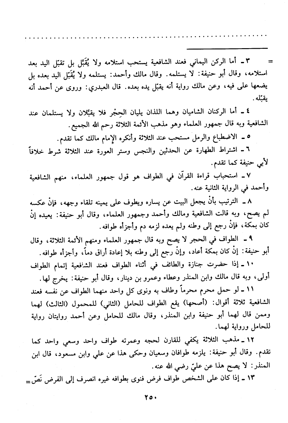 12 - مذهب الثلاثة يكفي للقارن لحجه وعمرته طواف واحد وسعي واحد كما تقدم. وقال أبو حنيفة: يلزمه طوافان وسعيان وحكى هذا عن علي وابن مسعود، قال ابن المنذر: لا يصح هذا عن علي رضي الله عنه.