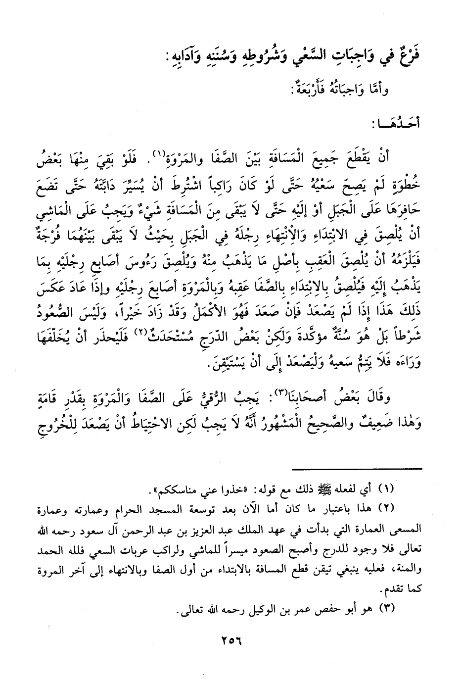 (¬2) هذا باعتبار ما كان أما الآن بعد توسعة المسجد الحرام وعمارته وعمارة المسعى العمارة التي بدأت في عهد الملك عبد العزيز بن عبد الرحمن آل سعود رحمه الله تعالى فلا وجود للدرج وأصبح الصعود ميسراً للماشي ولراكب عربات السعي فلله الحمد والمنة، فعليه ينبغي تيقن قطع المسافة بالابتداء من أول الصفا وبالانتهاء إلى آخر المروة كما تقدم.
