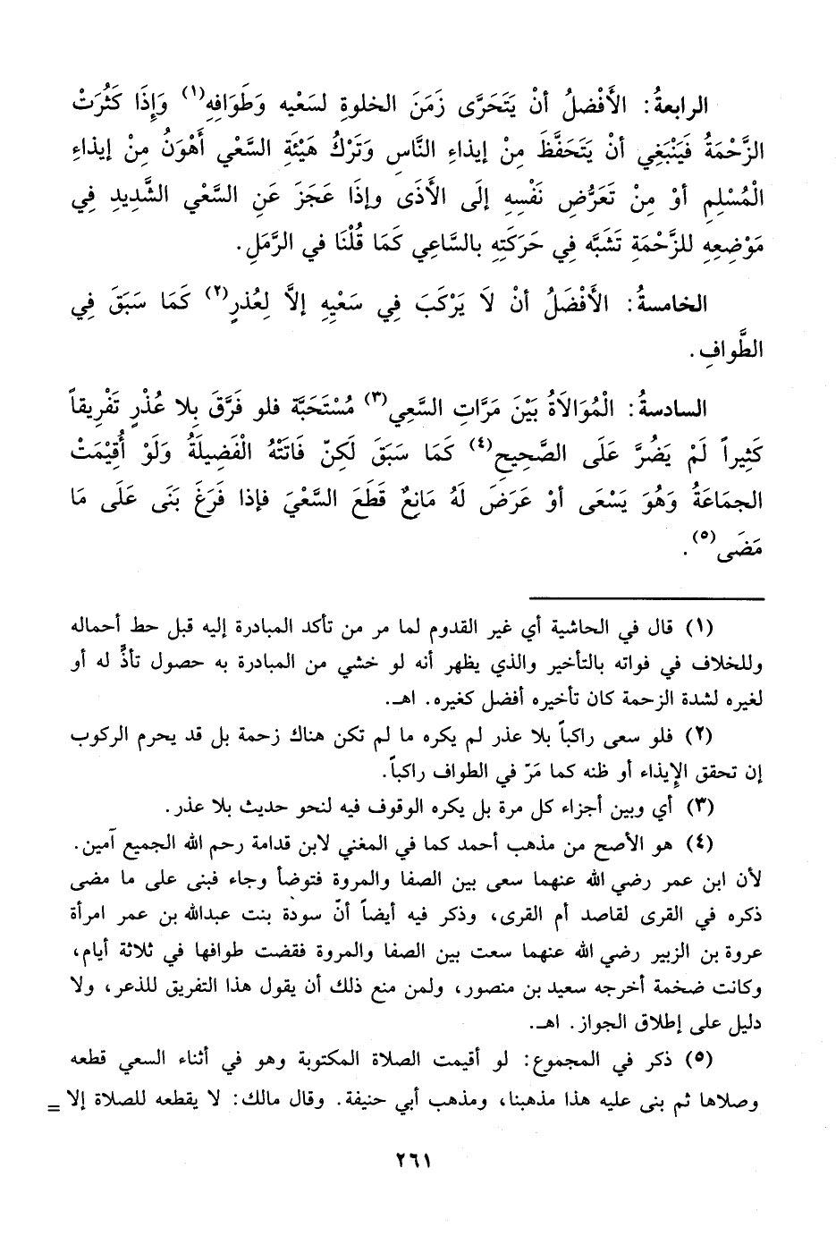 (¬4) هو الأصح من مذهب أحمد كما في المغني لابن قدامة رحم الله الجميع آمين. لأن ابن عمر رضي الله عنهما سعى بين الصفا والمروة فتوضأ وجاء فبنى على ما مضى ذكره في القرى لقاصد أم القرى، وذكر فيه أيضاً أن سودة بنت عبد الله بن عمر امرأة عروة بن الزبير رضي الله عنهما سعت بين الصفا والمروة فقضت طوافها في ثلاثة أيام، وكانت ضخمة أخرجه سعيد بن منصور، ولمن منع ذلك أن يقول هذا التفريق للذعر، ولا دليل على إطلاق الجواز. اهـ.