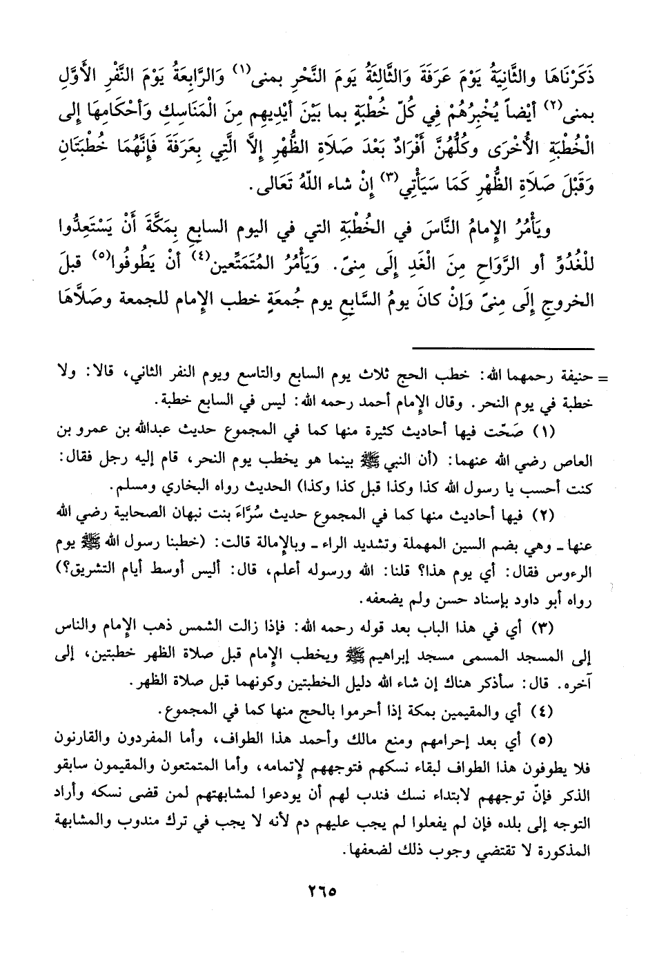ذَكَرْنَاهَا والثانِيةُ يَوْمَ عَرَفَةَ وَالثالِثَةُ يَومَ النَّحْرِ بمنى (¬1) وَالرَّابِعَةُ يَوْمَ النَّفْرِ الأَوَّلِ بمنى (¬2) أيْضاً يُخْبِرُهُمْ فِي كُلّ خُطْبةٍ بما بَيْنَ أيْدِيهِم مِنَ الْمَنَاسِكِ وَأحْكَامِهَا إِلى الْخُطْبَةِ الأُخْرَى وكُلُّهُنَّ أَفْرَادٌ بَعْدَ صَلاَةِ الظهْرِ إِلا التِي بِعَرَفَةَ فَإِنَّهُمَا خُطْبَتَانِ وَقَبْلَ صَلاَةِ الظُّهْرِ كَمَا سَيَأتِي (¬3) إِنْ شاء اللهُ تَعَالى.