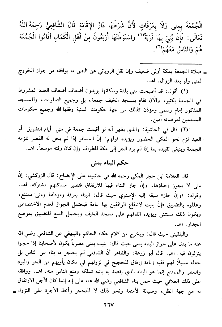 (¬1) أقول: قد أصبحت منى بلدة وسكانها يزيدون أضعاف أضعاف العدد المشروط في الجمعة بكثير، والآن تقام بمسجد الخيف جمعة، بل وجميع الصلوات، وللمسجد المذكور إمام رسمي ومؤذن كذلك من جهة حكومتنا السنية وفقها الله وجميع حكومات المسلمين لمرضاته آمين.