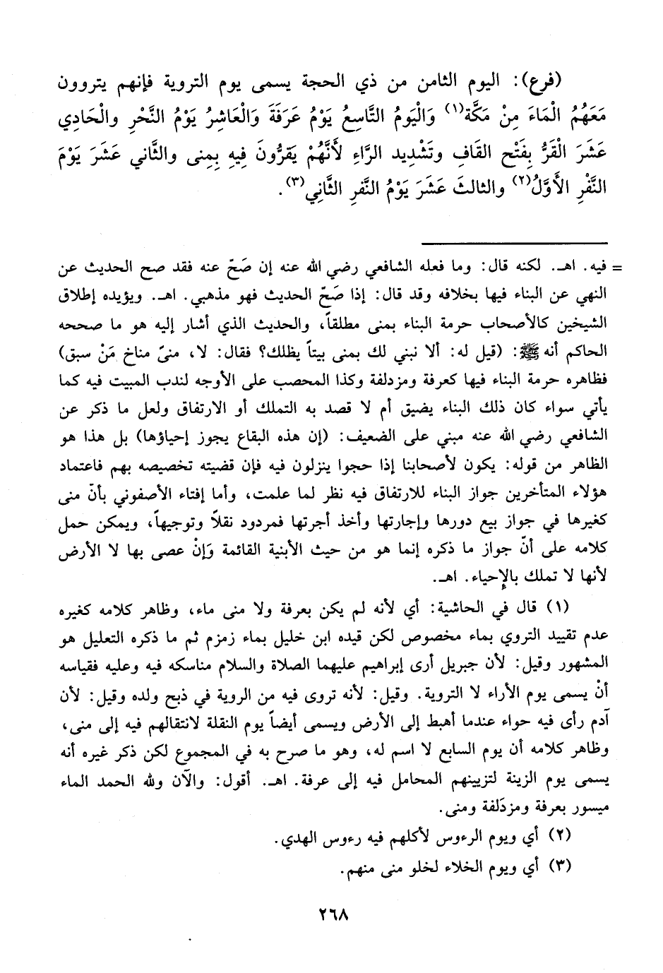 (¬1) قال في الحاشية: أي لأنه لم يكن بعرفة ولا منى ماء، وظاهر كلامه كغيره عدم تقييد التروي بماء مخصوص لكن قيده ابن خليل بماء زمزم ثم ما ذكره التعليل هو المشهور وقيل: لأن جبريل أرى إبراهيم عليهما الصلاة والسلام مناسكه فيه وعليه فقياسه أنْ يسمى يوم الأراء لا التروية. وقيل: لأنه تروى فيه من الروية في ذبح ولده وقيل: لأن آدم رأى فيه حواء عندما أهبط إلى الأرض ويسمى أيضاً يوم النقلة لانتقالهم فيه إلى منى، وظاهر كلامه أن يوم السابع لا اسم له، وهو ما صرح به في المجموع لكن ذكر غيره أنه يسمى يوم الزينة لتزيينهم المحامل فيه إلى عرفة. اهـ. أقول: والآن ولله الحمد الماء ميسور بعرفة ومزدَلفة ومنى.