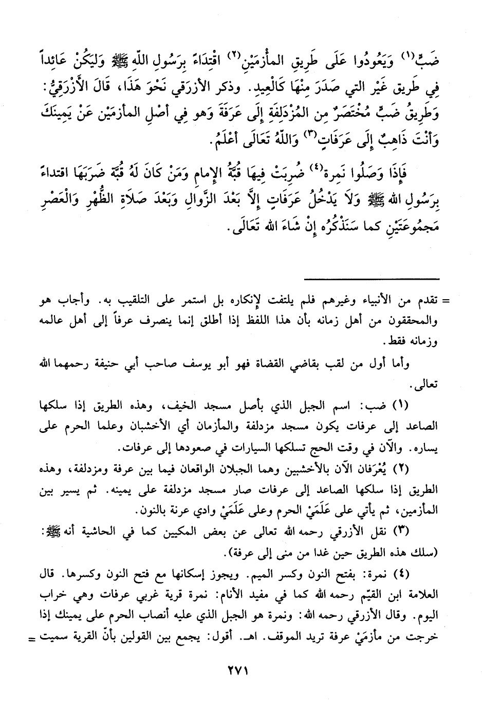 (¬4) نمرة: بفتح النون وكسر الميم. ويجوز إسكانها مع فتح النون وكسرها. قال العلامة ابن القيم رحمه الله كما في مفيد الأنام: نمرة قرية غربي عرفات وهي خراب اليوم. وقال الأزرقي رحمه الله: ونمرة هو الجبل الذي عليه أنصاب الحرم على يمينك إذا خرجت من مأزمَيْ عرفة تريد الموقف. اهـ. أقول: يجمع بين القولين بأن القرية سميت =