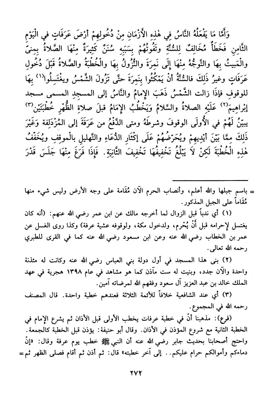 وَأَمَّا مَا يفْعَلُهُ النَّاسُ فِي هذه الأَزْمَانِ مِنْ دُخُولهِمْ أرْضَ عَرَفَات في الْيَوْمِ الثامِنِ فَخَطَأٌ مُخَالِفٌ لِلسُنَّةِ وتَفُوتُهُمْ بِسَبَبِهِ سُنَنٌ كَثِيرَة مِنْهَا الصَّلاةُ بِمِنى والْمَبيتُ بِهَا والتَّوجهُ مِنْهَا إِلَى نَمِرَةَ والنُّزُولُ بِهَا والْخُطْبةُ والصَّلاةُ قَبْلَ دُخُولِ عَرَفَات وغيرُ ذَلِكَ فالسُّنَّةُ أنْ يَمْكُثُوا بِنَمِرَةَ حتَّى تَزُولَ الشَّمْسُ ويغْتَسِلُوا (¬1) بِهَا للوقوفِ فإذَا زالت الشَّمْسُ ذهَبَ الإِمامُ والنَّاسُ إلى المسجِدِ المسمى مسجد إبْراهِيمَ (¬2) عَلَيْهِ الصلاةُ والسَّلامُ وَيَخْطُبُ الإِمَامُ قبلَ صلاةِ الظُّهْرِ خُطْبَتَيْن (¬3) يبين لَهُمْ في الأولَى الوقوفَ وشرطَهُ ومتى الدَّفْعُ من عَرَفَةَ إلى المُزْدَلِفة وَغَيْرَ ذَلِكَ مِمَّا بَيْنَ أيْدِيهِمْ ويُحَرّضُهُمْ عَلَى إكْثَارِ الدُّعَاءِ والتهليلِ بالْموقِفِ ويُخَفّفُ هذه الْخُطْبةَ لَكِنْ لاَ يَبْلُغُ تَخْفِيفُهَا تَخْفِيفَ الثَّانِيةِ. فَإِذَا فَرَغَ مِنْهَا جَلَسَ قَدْرَ