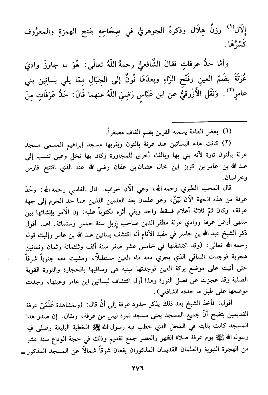 أقول: فأخذ الشيخ بعد ذلك يذكر حدود عرفة إلى أنْ قال: (وبمشاهدة عَلَمَيْ عرفة القديمين يتضح أنّ جميع المسجد يعني مسجد نمرة ليس من عرفة، ويقال: إن صدر هذا المسجد كانت بنايته في المحل الذي خطب فيه رسول الله - صلى الله عليه وسلم - الخطبة البليغة وصلى فيه رسول الله - صلى الله عليه وسلم - يوم عرفة صلاة الظهر والعصر جمع تقديم وذلك في حجة الوداع سنة عشر من الهجرة النبوية والعلمان القديمان المذكوران يقعان شرقاً شمالاً عن المسجد المذكور =