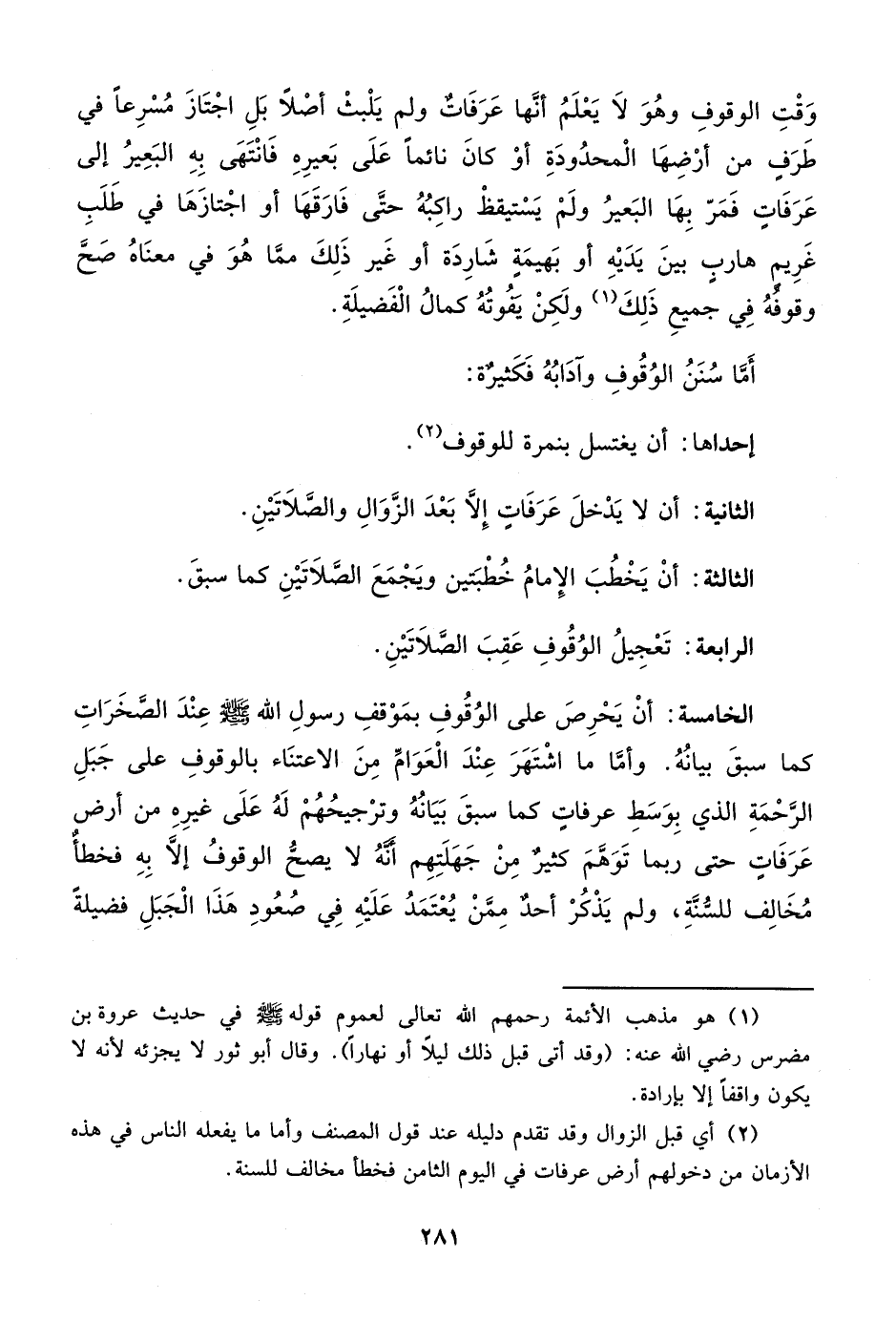 الخامسة: أنْ يَحْرِصَ على الوُقُوفِ بمَوْقفِ رسولِ الله - صلى الله عليه وسلم - عِنْدَ الصَّخَرَاتِ كما سبقَ بيانُهُ. وأمَّا ما اشْتَهَرَ عِنْدَ الْعَوَامِّ مِنَ الاعتنَاء بالوقوفِ على جَبَلِ الرَّحْمَةِ الذي بِوَسَطِ عرفاتٍ كما سبقَ بَيَانُهُ وترْجيحُهُمْ لَهُ عَلَى غيرِهِ من أرض عَرَفَاتٍ حتى ربما تَوَهَّمَ كثيرٌ مِنْ جَهَلَتِهِم أنَّهُ لا يصحُّ الوقوفُ إلاَّ بِهِ فخطأ مُخَالِف للسُّنَّةِ، ولم يَذْكُرْ أحدٌ مِمَنْ يُعْتَمَدُ عَلَيْهِ فِي صُعُودِ هَذَا الْجَبَلِ فضيلةً