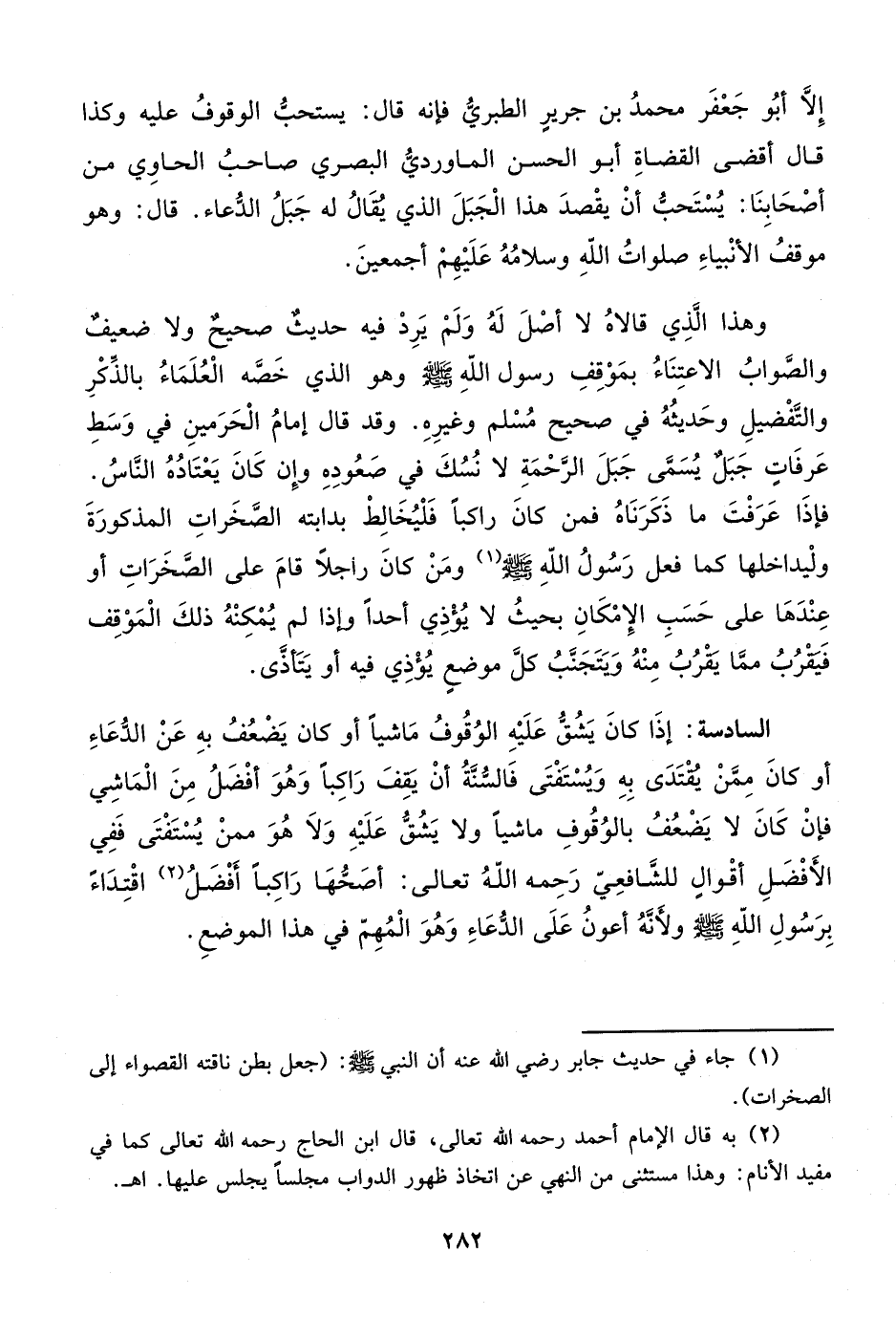 إِلاَّ أبُو جَعْفَر محمدُ بن جريرِ الطبريُّ فإنه قال: يستحب الوقوفُ عليه وكذا قال أقضى القضاةِ أبو الحسن الماورديُّ البصري صاحبُ الحاوِي من أصْحَابِنَا: يُسْتَحبُّ أنْ يقْصدَ هذا الْجَبَلَ الذي يقالُ له جَبَلُ الدُّعاء. قال: وهو موقفُ الأنْبياءِ صلواتُ اللهِ وسلامُهُ عَلَيْهِمْ أجمعينَ.