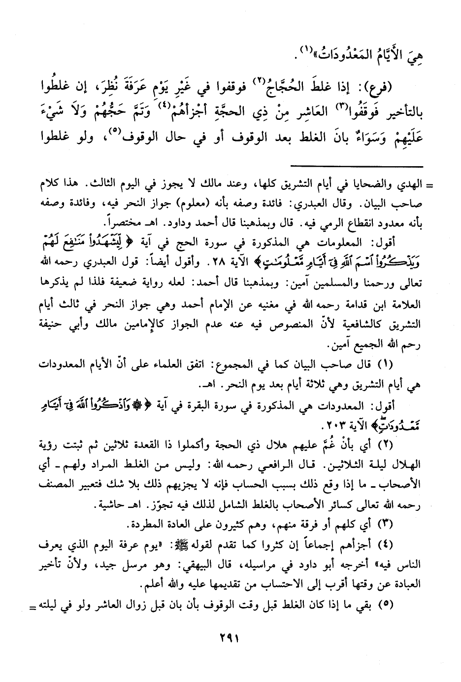 أقول: المعلومات هي المذكورة في سورة الحج في آية {لِيَشْهَدُوا مَنَافِعَ لَهُمْ وَيَذْكُرُوا اسْمَ اللَّهِ فِي أَيَّامٍ مَعْلُومَاتٍ} الآية 28. وأقول أيضاً: قول العبدري رحمه الله تعالى ورحمنا والمسلمين آمين: وبمذهبنا قال أحمد: لعله رواية ضعيفة فلذا لم يذكرها العلامة ابن قدامة رحمه الله في مغنيه عن الإمام أحمد وهي جواز النحر في ثالث أيام التشريق كالشافعية لأن المنصوص فيه عنه عدم الجواز كالإمامين مالك وأبي حنيفة رحم الله الجميع آمين.