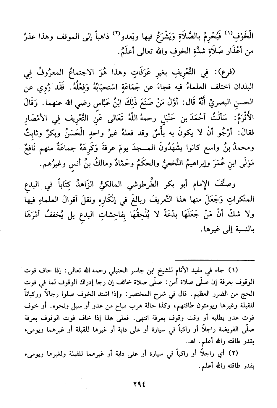 (¬1) جاء في مفيد الأنام للشيخ ابن جاسر الحنبلي رحمه الله تعالى: إذا خاف فوت الوقوف بعرفة إن صلى صلاة أمن: صلى صلاة خائف إن رجا إدراك الوقوف لما في فوت الحج من الضرر العظيم. قال في شرح المختصر: وإذا اشتد الخوف صلوا رجالاً وركباناً للقبلة وغيرها ويومئون طاقتهم، وكذا حالة هرب مباح من عدو أو سيل ونحوه. أو خوف فوت عدو يطلبه أو وقت وقوف بعرفة انتهى. فعلى هذا إذا خاف فوت الوقوف بعرفة صلى الفريضة راجلاً أو راكباً في سيارة أو على دابة أو غيرها للقبلة أو غيرهما ويومىء بقدر طاقته والله أعلم. اهـ.