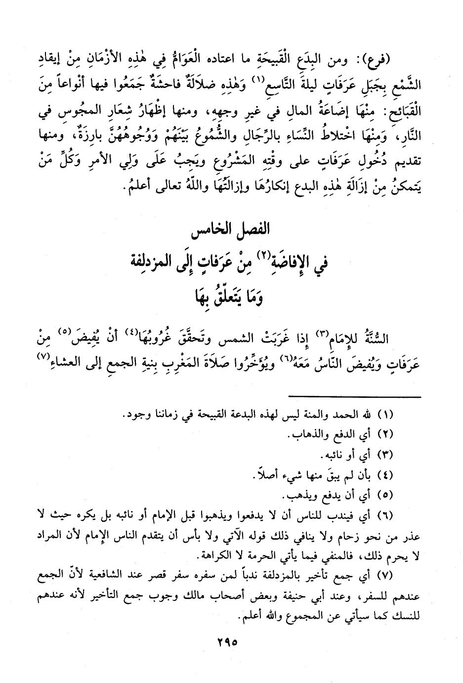 السُّنَّةُ للإمَامِ (¬3) إِذا غَرَبَتْ الشمس وتَحققَ غُرُوبُهَا (¬4) أنْ يُفِيضَ (¬5) مِنْ عَرَفَاتٍ وَيُفيضَ الناسُ مَعَهُ (¬6) ويُؤَخرُوا صَلاَةَ المَغْرِبِ بِنيةِ الجمعِ إلى العشاءِ (¬7)