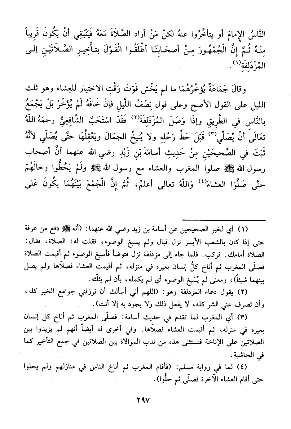 النَّاسُ الإِمامَ أو يتأخرُوا عنهُ لكنْ مَنْ أراد الصَّلاَةَ مَعَهُ فَيَنْبَغِي أنْ يَكُونَ قَرِيباً مِنْهُ ثُمَّ إِنَّ الْجُمْهُورَ مِنْ أصحَابِنَا أطْلَقُوا الْقَوْلَ بتأْخِيرِ الصَّلاَتَيْنِ إلى المُزْدَلِفَةِ (¬1).