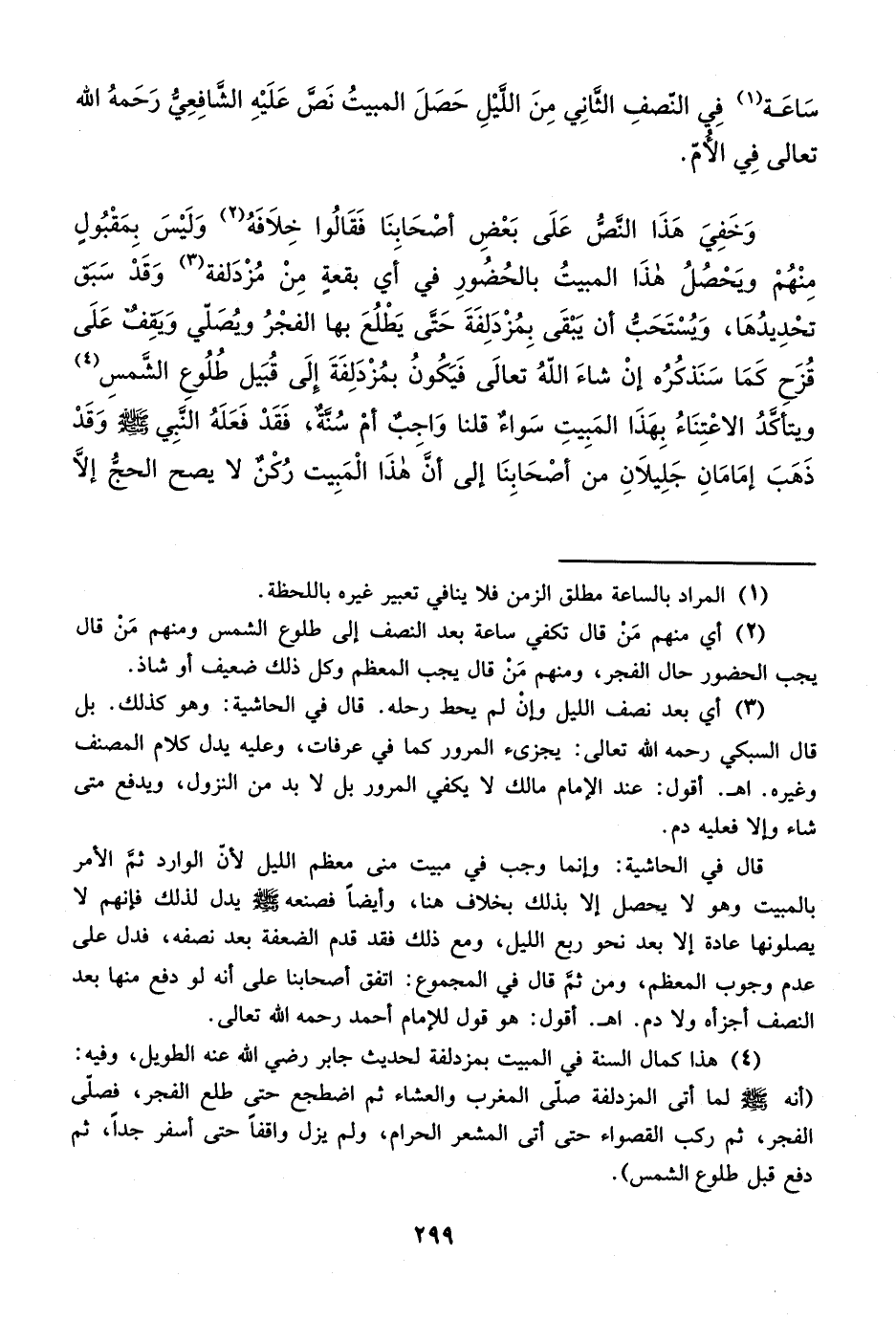 وَخَفِيَ هَذَا النَّص عَلَى بَعْضِ أصْحَابنَا فَقَالُوا خِلاَفَهُ (¬2) وَلَيْسَ بِمَقْبُول مِنْهُمْ ويَحْصُلُ هذَا المبيتُ بالحُضُورِ في أَي بقعة مِنْ مُزْدَلفة (¬3) وَقَدْ سَبق تحْدِيدُهَا، وَيُسْتَحَب أن يَبْقَى بِمُزْدَلِفَةَ حَتى يَطْلُعَ بها الفجْرُ ويُصَلّي وَيقِف عَلَى قُزَحِ كَمَا سَنَذكُرُه إنْ شاءَ اللهُ تعالَى فَيَكُونُ بمُزْدَلِفَةَ إِلَى قُبَيل طُلُوعِ الشَّمسِ (¬4) ويتأكَدُ الاعْتِنَاءُ بِهَذَا المَبِيتِ سَواءٌ قلنا وَاجِبٌ أمْ سُنَّةٌ، فَقَدْ فَعَلَهُ النَّبِي - صلى الله عليه وسلم - وَقَدْ ذهبَ إمَامَانِ جَلِيلاَنِ من أصْحَابِنَا إلى أن هذَا الْمَبِيت رُكْنٌ لا يصح الحج إلاَّ