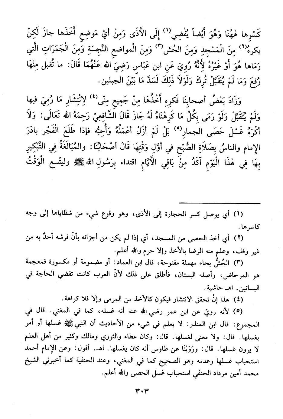 (¬5) لأنه روي عن ابن عمر رضي الله عنه أنه غسله، كما في المغني. قال في المجموع: قال ابن المنذر: لا يعلم في شيء من الأحاديث أن النبي - صلى الله عليه وسلم - غسلها أو أمر بغسلها. قال: ولا معنى لغسلها. قال: وكان عطاء والثوري ومالك وكثير من أهل العلم لا يرون غسلها. قال: ورَوَيْنَا عن طاوس أنه كان يغسلها. اهـ أقول: وعن الإمام أحمد استحباب غسلها وعدمه وهو الصحيح كما في المغني، وعند الحنفية كما أخبرني الشيخ محمد أمين مرداد الحنفي استحباب غسل الحصى والله أعلم.