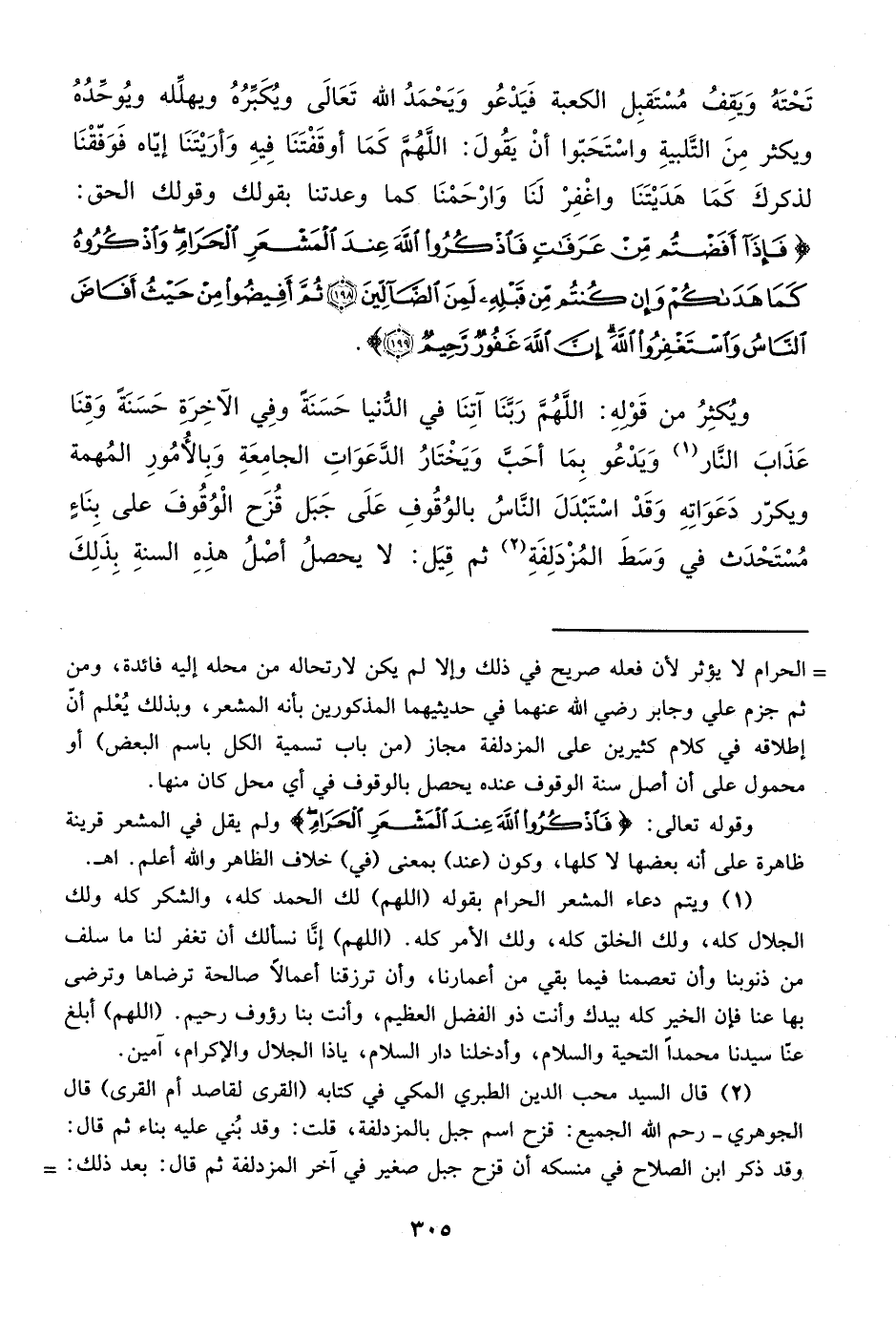 (¬1) ويتم دعاء المشعر الحرام بقوله (اللهم) لك الحمد كله، والشكر كله ولك الجلال كله، ولك الخلق كله، ولك الأمر كله. (اللهم) إنا نسألك أن تغفر لنا ما سلف من ذنوبنا وأن تعصمنا فيما بقي من أعمارنا، وأن ترزقنا أعمالاً صالحة ترضاها وترضى بها عنا فإن الخير كله بيدك وأنت ذو الفضل العظيم، وأنت بنا رؤوف رحيم. (اللهم) أبلغ عنا سيدنا محمداً التحية والسلام، وأدخلنا دار السلام، يا ذا الجلال والإكرام، آمين.