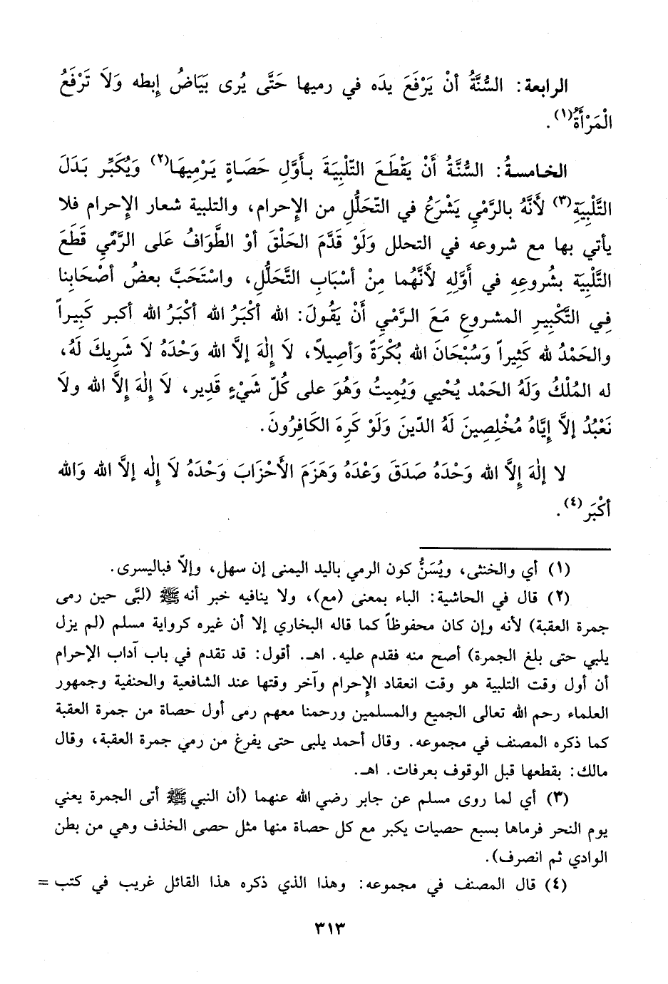الخامسةُ: السُّنَّةُ أَنْ يقْطَعَ التّلْبِيَةَ بأَوَّلِ حَصَاة يَرْمِيهَا (¬2) وَيُكَبِّر بَدَلَ التَّلْبِيَةِ (¬3) لأَنَهُ بالرمْيِ يَشْرَعُ في التّحَللِ من الإِحرام، والتلبية شعار الإِحرام فلا يأتي بها مع شروعه في التحلل وَلَوْ قَدمَ الحَلْقَ أوْ الطوَافُ عَلى الرَّميِ قَطَعَ التَّلْبِية بشُروعِهِ في أَوَّلِهِ لأَنَّهُما مِنْ أسْبَابِ التحَللِ، واسْتَحَبَّ بعضُ أصْحَابِنا فِي التكْبِيرِ المشروعِ مَعَ الرمْيِ أَنْ تقُولَ: الله أكْبَرُ الله أكْبَرُ الله أكبر كَبِيراً والحَمْدُ لله كَثِيراً وَسُبْحَانَ الله بُكْرَة وَأصِيلاً، لاَ إِلهَ إلاَّ الله وَحْدَهُ لاَ شَرِيكَ لَهُ، له المُلْكُ وَلَهُ الحَمْد يحْيي وَيُمِيتُ وَهُوَ على كُلّ شَيْء قَدِير، لاَ إِلهَ إِلا الله ولاَ نَعْبُدُ إلا إِيَّاهُ مُخْلِصِينَ لَهُ الدّينَ وَلَوْ كَرِهَ الكَافِرُونَ.