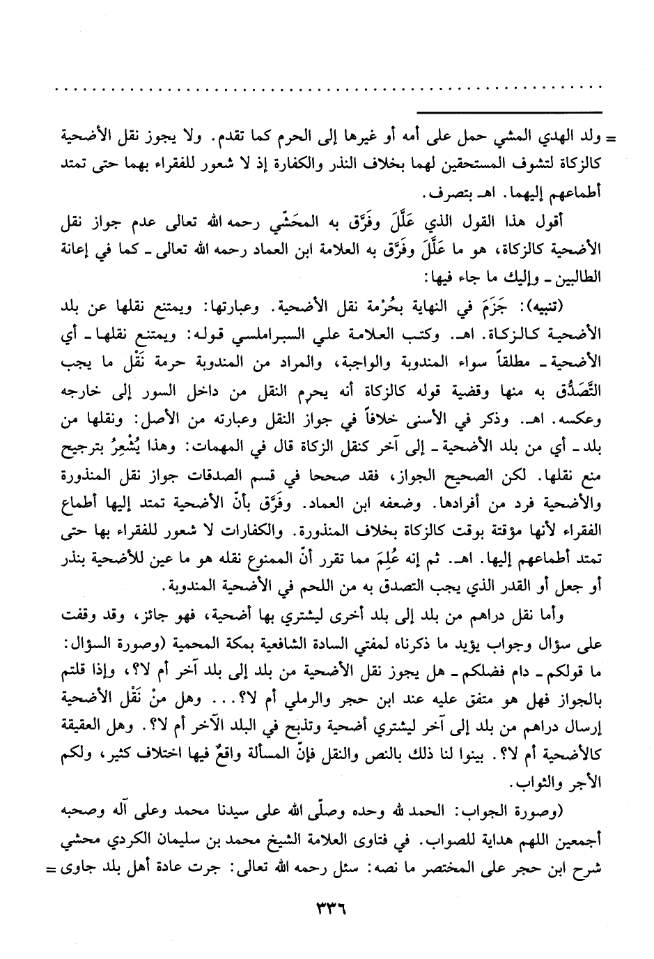 أقول هذا القول الذي عَللَ وفَرق به المحَشي رحمه الله تعالى عدم جواز نقل الأضحية كالزكاة، هو ما عَللَ وفَرق به العلامة ابن العماد رحمه الله تعالى -كما في إعانة الطالبين- وإليك ما جاء فيها:
