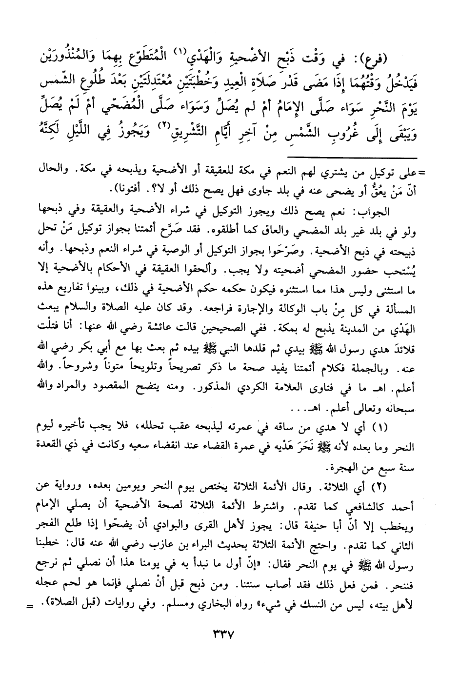 (¬2) أي الثلاثة. وقال الأئمة الثلاثة يختص بيوم النحر ويومين بعده، ورواية عن أحمد كالشافعي كما تقدم. واشترط الأئمة الثلاثة لصحة الأضحية أن يصلي الإمام ويخطب إلا أن أبا حنيفة قال: يجوز لأهل القرى والبوادي أن يضحوا إذا طلع الفجر الثاني كما تقدم. واحتج الأئمة الثلاثة بحديث البراء بن عازب رضي الله عنه قال: خطبنا رسول الله - صلى الله عليه وسلم - في يوم النحر فقال: "إن أول ما نبدأ به في يومنا هذا أن نصلي ثم نرجع فننحر. فمن فعل ذلك فقد أصاب سنتنا. ومن ذبح قبل أنْ نصلي فإنما هو لحم عجله لأهل بيته، ليس من النسك في شيء" رواه البخاري ومسلم. وفي روايات (قبل الصلاة). =