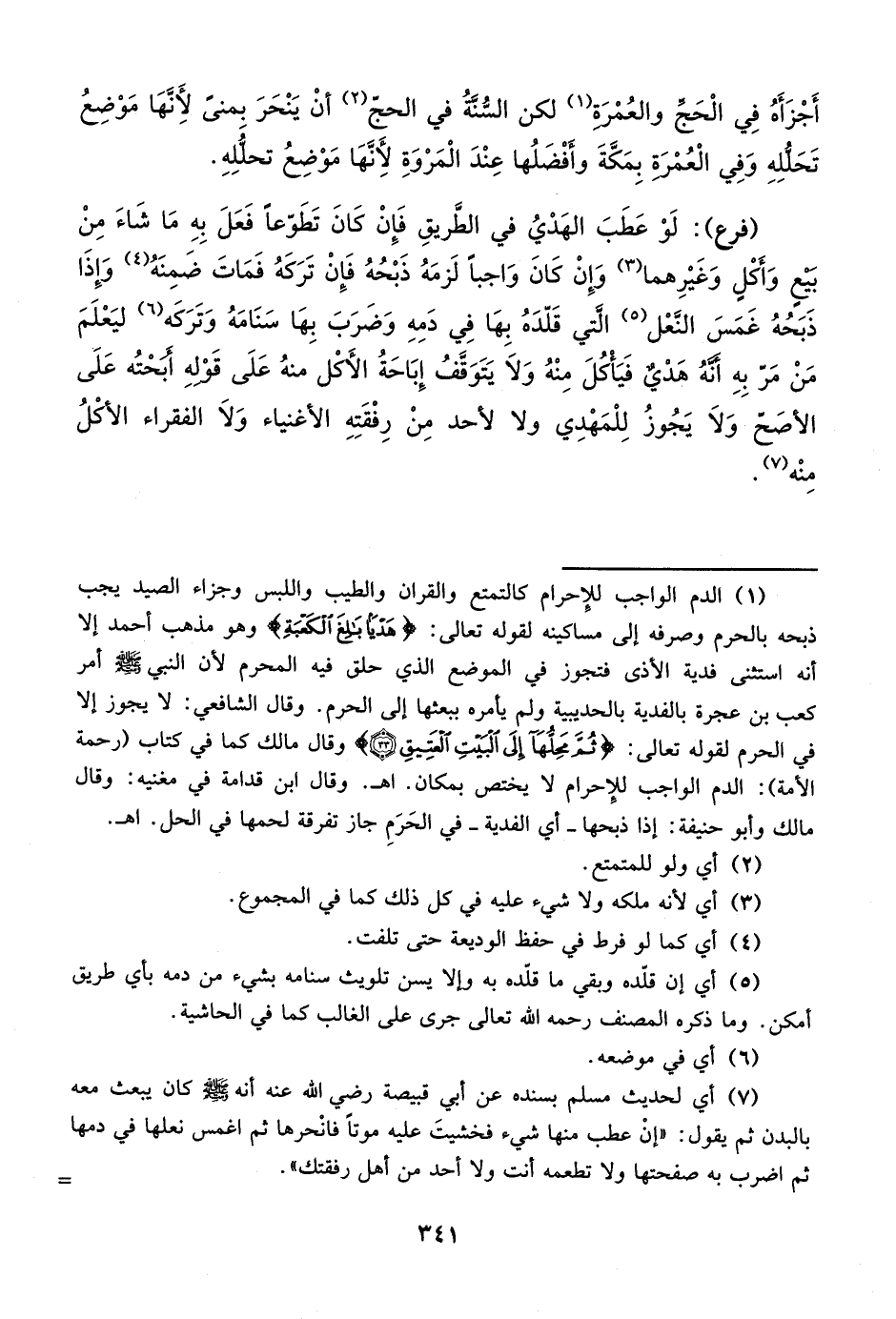 ذَبَحُهُ غَمَسَ النَّعْل (¬5) التي قَلدَهُ بِهَا فِي دَمِهِ وَضَرَبَ بِهَا سَنَامَهُ وَتَرَكَه (¬6) ليَعْلَمَ مَنْ مَرّ بِهِ أنهُ هَدْي فَيَأْكُلَ مِنْهُ وَلاَ يَتَوَقفُ إِبَاحَةُ الأَكْل منهُ عَلَى قَوْلهِ أَبحْتُه عَلَى الأصَح وَلاَ يَجُوزُ لِلْمَهْدِي ولا لأحد مِنْ رِفْقَتِهِ الأغنياء وَلاَ الفقراء الأكْلُ مِنْه (¬7).