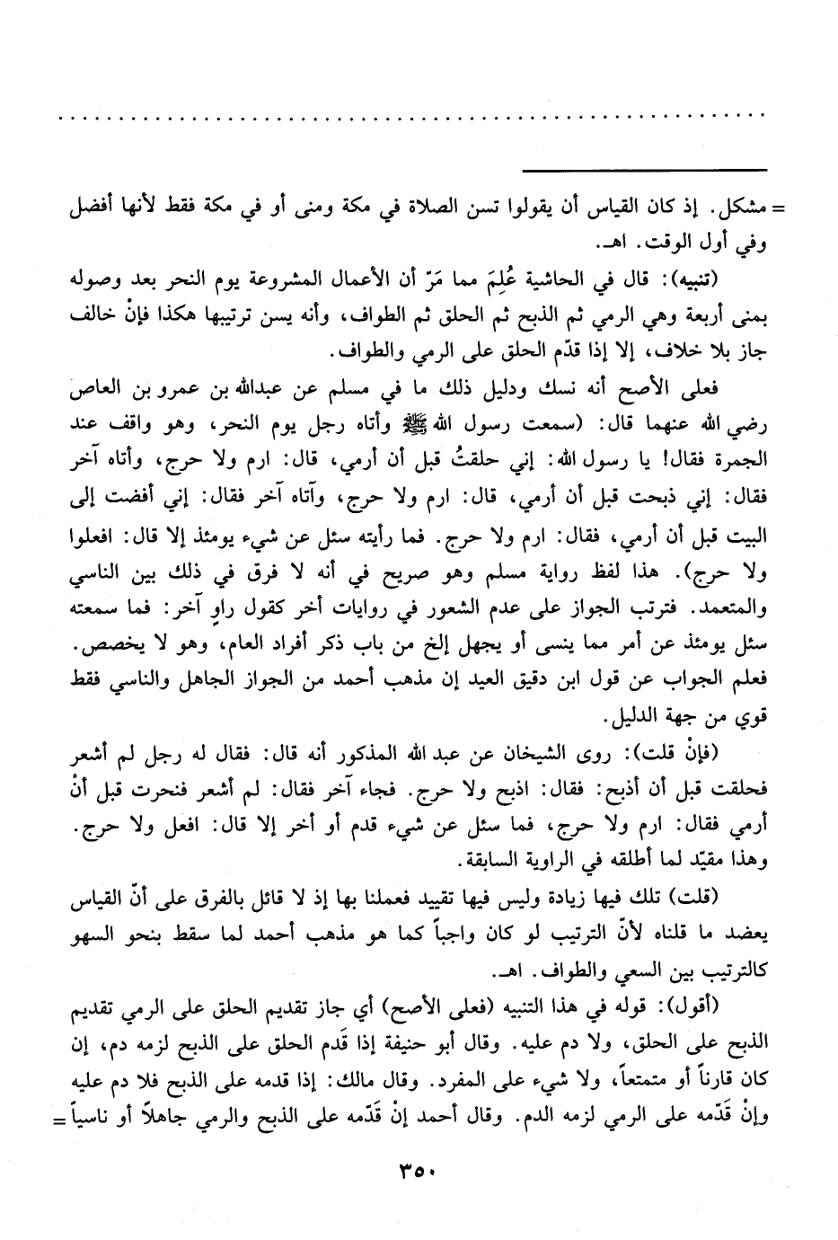 (أقول): قوله في هذا التنبيه (فعلى الأصح) أي جاز تقديم الحلق على الرمي تقديم الذبح على الحلق، ولا دم عليه. وقال أبو حنيفة إذا قَدم الحلق على الذبح لزمه دم، إن كان قارناً أو متمتعاً، ولا شيء على المفرد. وقال مالك: إذا قدمه على الذبح فلا دم عليه وإنْ قَدّمه على الرمي لزمه الدم. وقال أحمد إنْ قَدّمه على الذبح والرمي جاهلاً أو ناسياً =