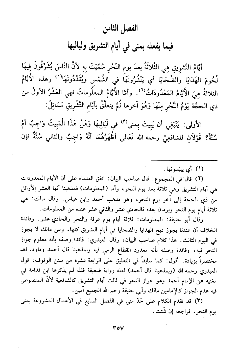وقال أبو حنيفة: المعلومات: ثلاثة أيام يوم عرفة والنحر والحادي عشر. وفائدة الخلاف أن عندنا يجوز ذبح الهدايا والضحايا في أيام التشريق كلها، وعن مالك لا يجوز في اليوم الثالث. هذا كلام صاحب البيان، وقال العبدري: فائدة وصفه بأنه معلوم جواز النحر فيه، وفائدة وصفه بأنه معدود إنقطاع الرمي فيه وبمذهبنا قال أحمد وداود. اهـ مختصراً بزيادة. أقول: كما سابقاً في التعليق على الرابعة عشرة من سنن الوقوف: قول العبدري رحمه الله (وبمذهبنا قال أحمد) لعله رواية ضعيفة فلذا لم يذكرها ابن قدامة في مغنيه عن الإمام أحمد وهو جواز النحر في ثالث أيام التشريق كالشافعية لأن المنصوص فيه عدم الجواز كالإِمامين مالك وأبي حنيفة رحم الله الجميع آمين.