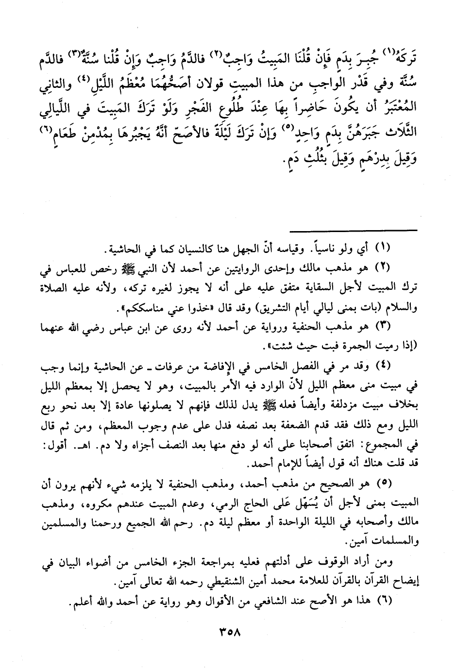 (¬5) هو الصحيح من مذهب أحمد، ومذهب الحنفية لا يلزمه شيء لأنهم يرون أن المبيت بمنى لأجل أن يُسَهل عَلى الحاج الرمي، وعدم المبيت عندهم مكروه، ومذهب مالك وأصحابه في الليلة الواحدة أو معظم ليلة دم. رحم الله الجميع ورحمنا والمسلمين والمسلمات آمين.