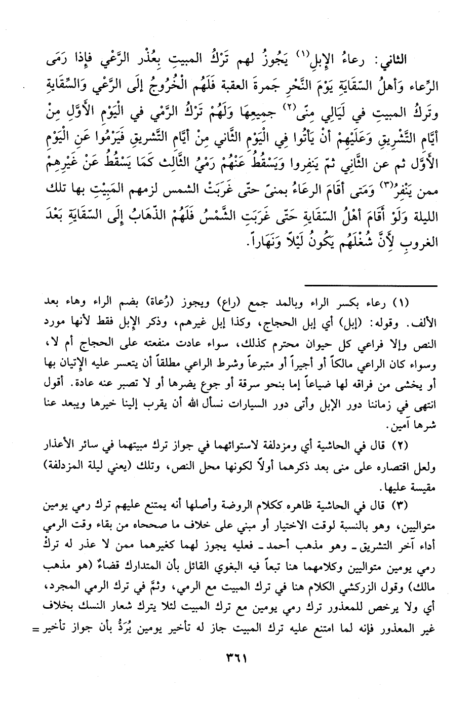 (¬1) رعاء بكسر الراء وبالمد جمع (راع) ويجوز (رُعاة) بضم الراء وهاء بعد الألف. وقوله: (إبل) أي إبل الحجاج، وكذا إبل غيرهم، وذكر الإِبل فقط لأنها مورد النص وإلا فراعي كل حيوان محترم كذلك، سواء عادت منفعته على الحجاج أم لا، وسواء كان الراعي مالكاً أو أجيراً أو متبرعاً وشرط الراعي مطلقاً أن يتعسر عليه الإِتيان بها أو يخشى من فراقه لها ضياعاً إما بنحو سرقة أو جوع يضرها أو لا تصبر عنه عادة. أقول انتهى في زماننا دور الإبل وأتى دور السيارات نسأل الله أن يقرب إلينا خيرها ويبعد عنا شرها آمين.