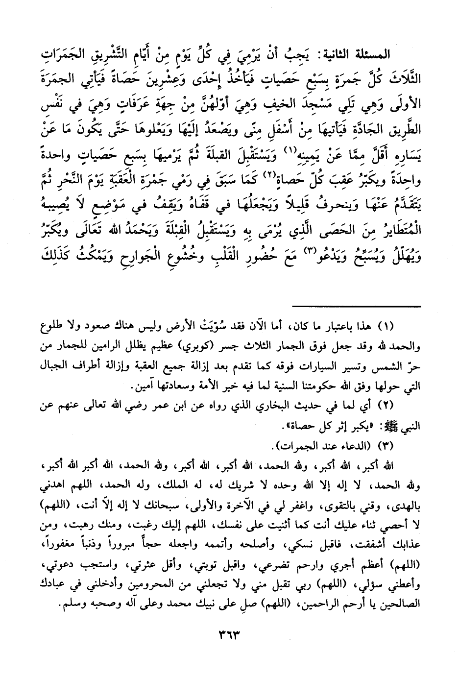(¬1) هذا باعتبار ما كان، أما الآن فقد سُويَت الأرض وليس هناك صعود ولا طلوع والحمد لله وقد جعل فوق الجمار الثلاث جسر (كوبري) عظيم يظلل الرامين للجمار من حر الشمس وتسير السيارات فوقه كما تقدم بعد إزالة جميع العقبة وإزالة أطراف الجبال التي حولها وفق الله حكومتنا السنية لما فيه خير الأمة وسعادتها آمين.