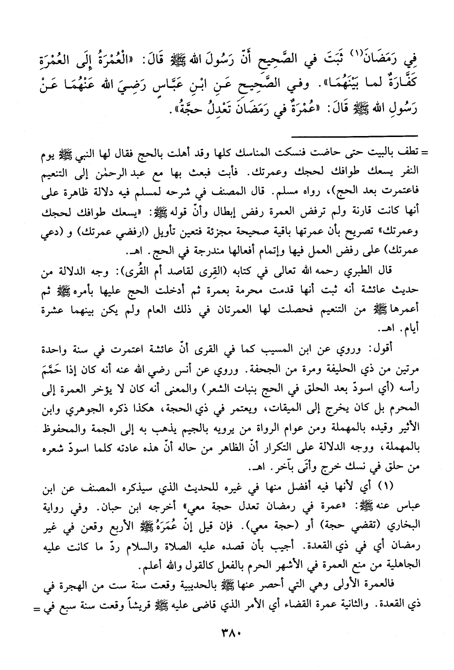 = تطف بالبيت حتى حاضت فنسكت المناسك كلها وقد أهلت بالحج فقال لها النبي - صلى الله عليه وسلم - يوم النفر يسعك طوافك لحجك وعمرتك. فأبت فبعث بها مع عبد الرحمن إلى التنعيم فاعتمرت بعد الحج)، رواه مسلم. قال المصنف في شرحه لمسلم فيه دلالة ظاهرة على أنها كانت قارنة ولم ترفض العمرة رفض إبطال وأن قوله - صلى الله عليه وسلم -: "يسعك طوافك لحجك وعمرتك" تصريح بأن عمرتها باقية صحيحة مجزئة فتعين تأويل (ارفضي عمرتك) و (دعي عمرتك) على رفض العمل فيها وإتمام أفعالها مندرجة في الحج. اهـ.