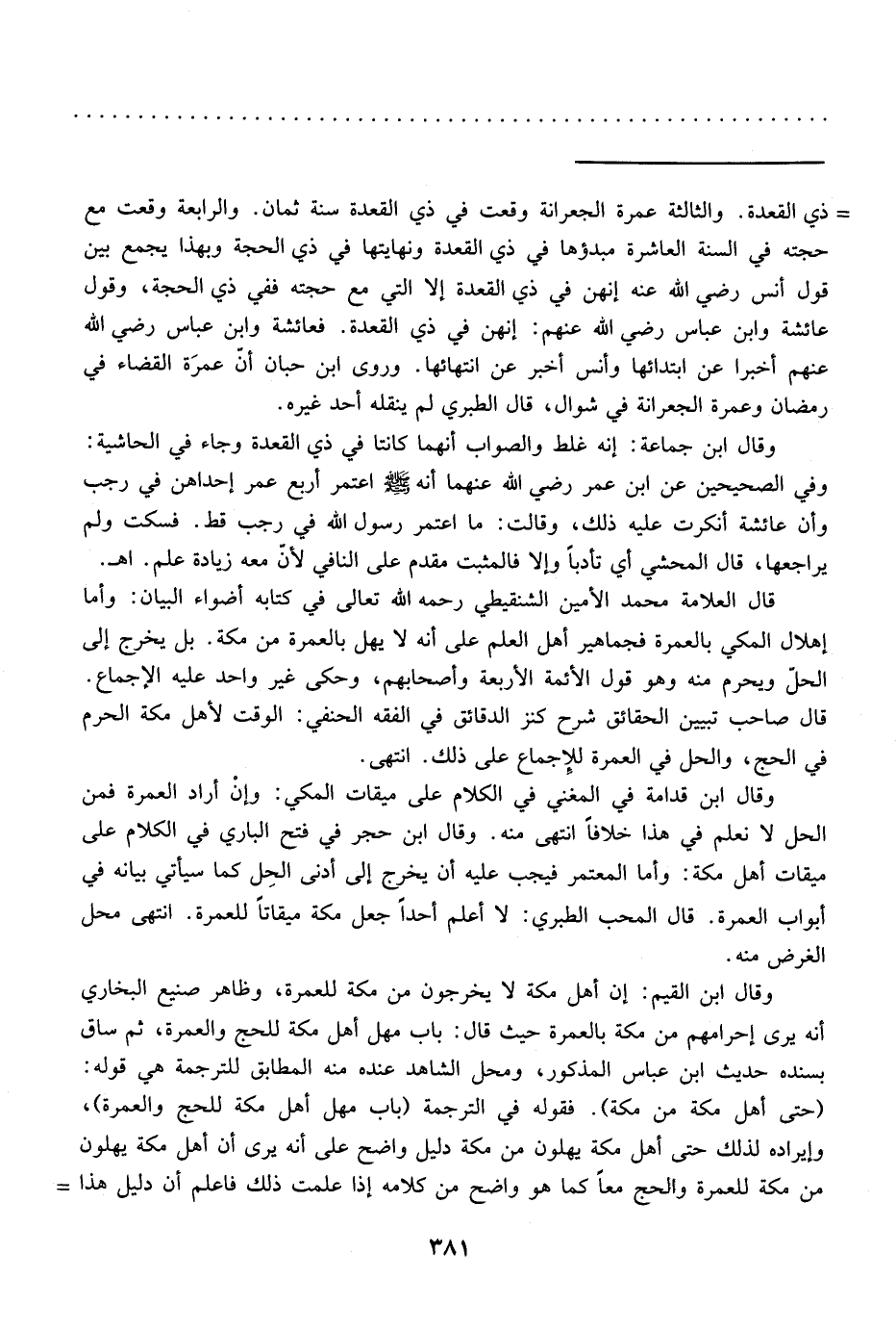 وقال ابن القيم: إن أهل مكة لا يخرجون من مكة للعمرة، وظاهر صنيع البخاري أنه يرى إحرامهم من مكة بالعمرة حيث قال: باب مهل أهل مكة للحج والعمرة، ثم ساق بسنده حديث ابن عباس المذكور، ومحل الشاهد عنده منه المطابق للترجمة هي قوله: (حتى أهل مكة من مكة). فقوله في الترجمة (باب مهل أهل مكة للحج والعمرة)، وإيراده لذلك حتى أهل مكة يهلون من مكة دليل واضح على أنه يرى أن أهل مكة يهلون من مكة للعمرة والحج معاً كما هو واضح من كلامه إذا علمت ذلك فاعلم أن دليل هذا =