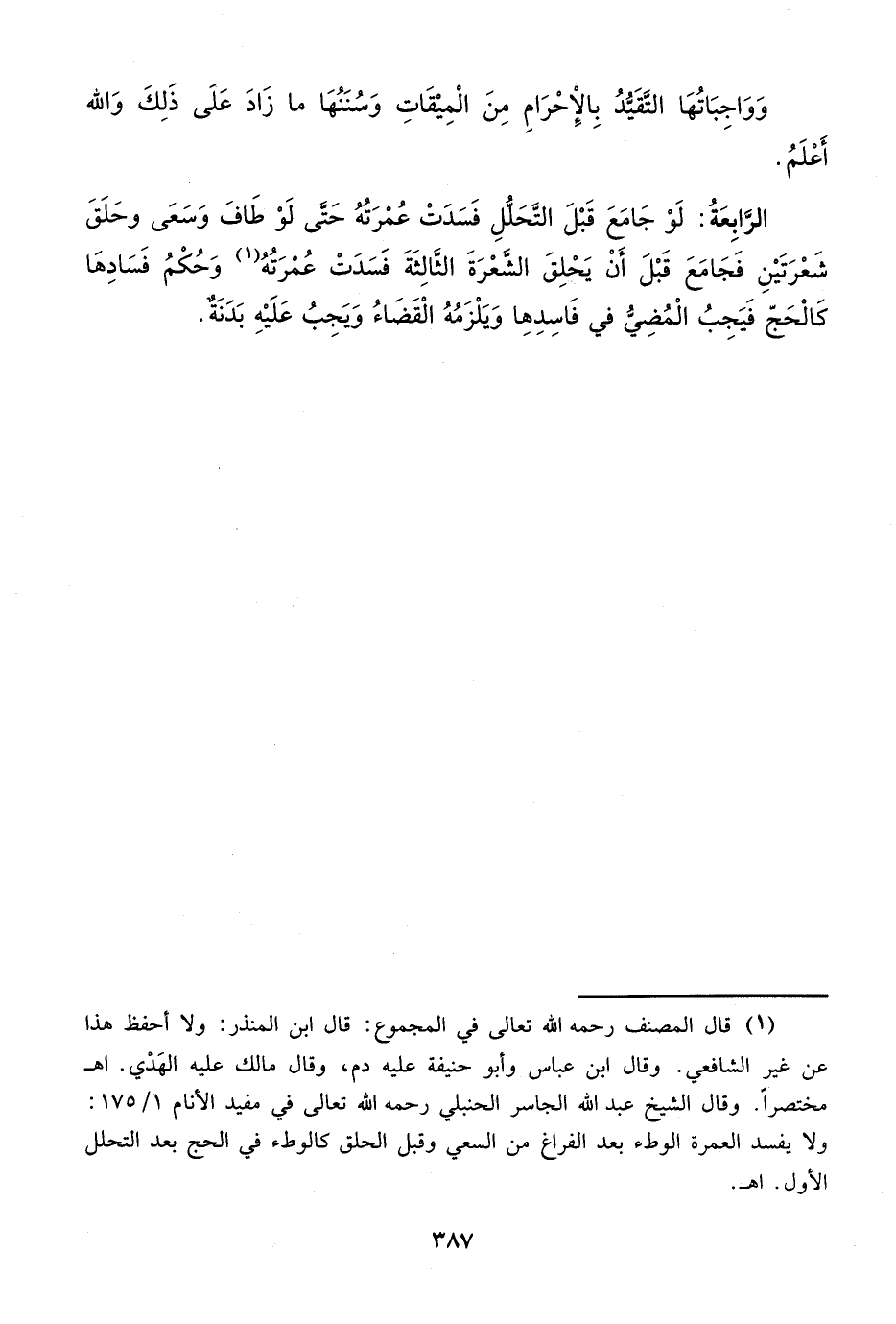 (¬1) قال المصنف رحمه الله تعالى في المجموع: قال ابن المنذر: ولا أحفظ هذا عن غير الشافعي. وقال ابن عباس وأبو حنيفة عليه دم، وقال مالك عليه الهَدْي. اهـ مختصراً. وقال الشيخ عبد الله الجاسر الحنبلي رحمه الله تعالى في مفيد الأنام 1/ 175: ولا يفسد العمرة الوطء بعد الفراغ من السعي وقبل الحلق كالوطء في الحج بعد التحلل الأول. اهـ.