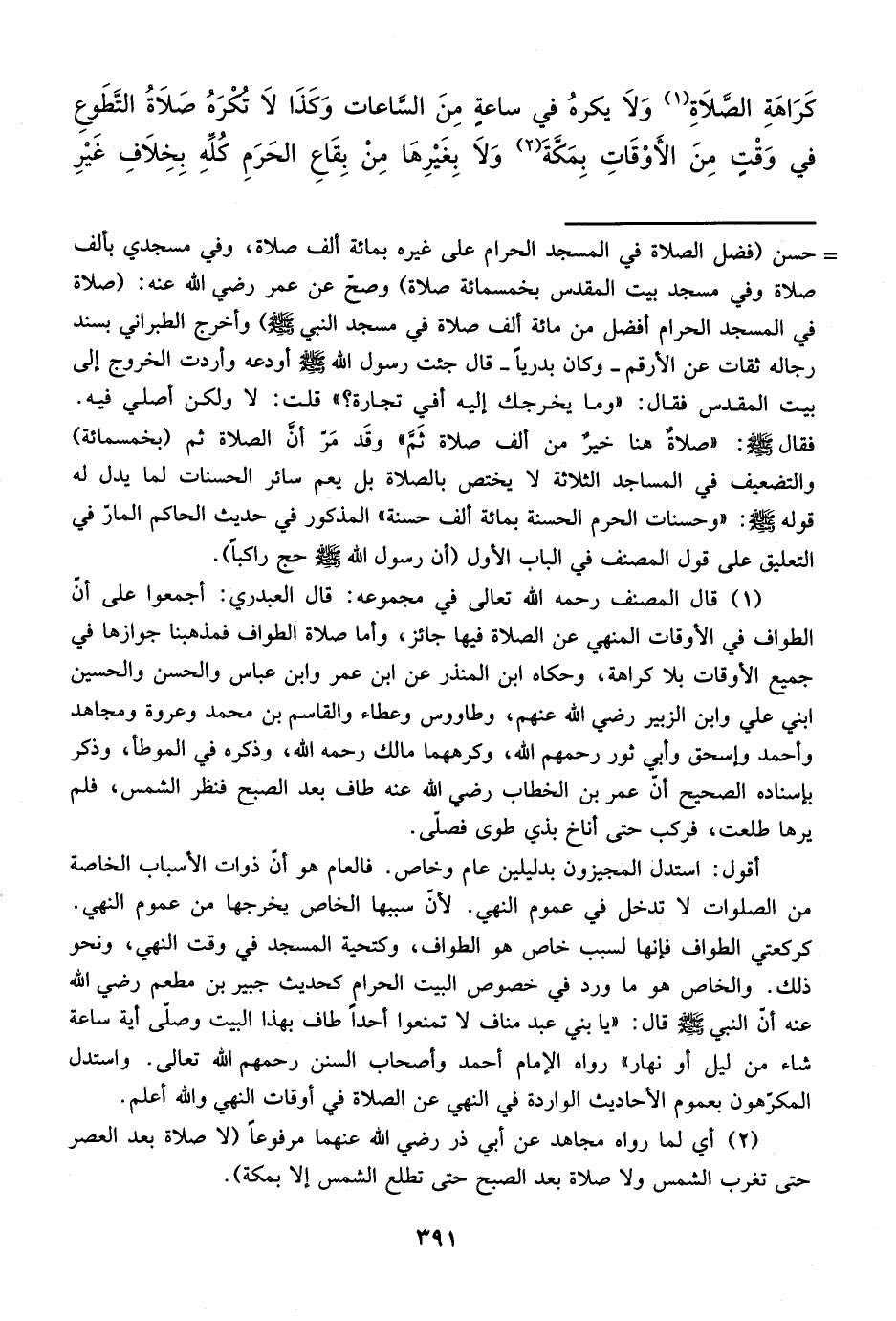 = حسن (فضل الصلاة في المسجد الحرام على غيره بمائة ألف صلاة، وفي مسجدي بألف صلاة وفي مسجد بيت المقدس بخمسمائة صلاة) وصح عن عمر رضي الله عنه: (صلاة في المسجد الحرام أفضل من مائة ألف صلاة في مسجد النبي - صلى الله عليه وسلم -) وأخرج الطبراني بسند رجاله ثقات عن الأرقم -وكان بدرياً- قال جئت رسول الله - صلى الله عليه وسلم - أودعه وأردت الخروج إلى بيت المقدس فقال: "وما يخرجك إليه أفي تجارة؟ " قلت: لا ولكن أصلي فيه.