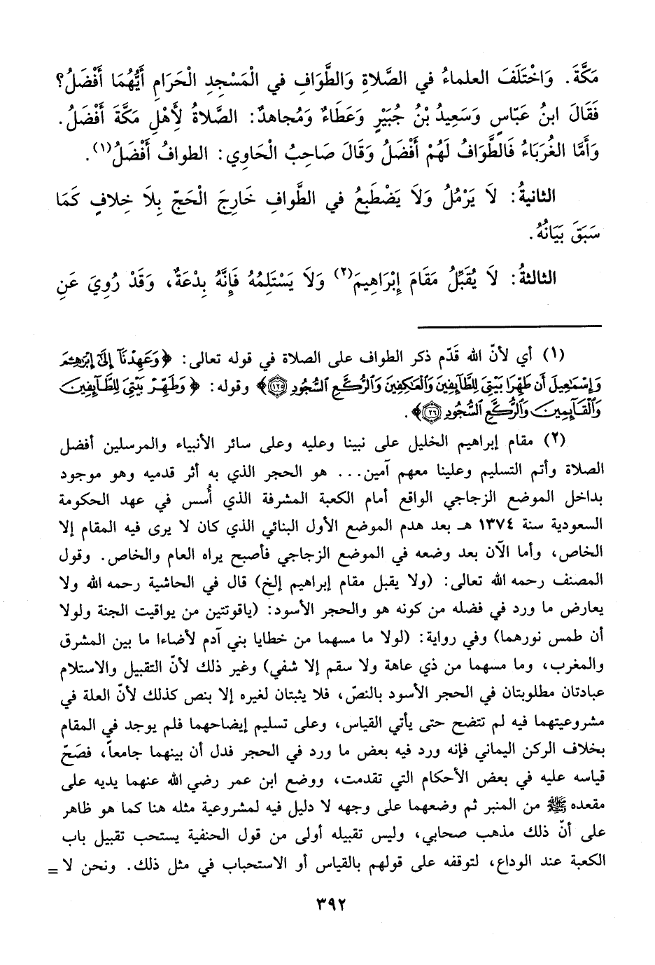 مَكَّةَ. وَاخْتَلَفَ العلماءُ في الصَّلاةِ وَالطَّوَافِ في الْمَسْجِدِ الْحَرَامِ أَيُّهُمَا أَفْضَلُ؟ فَقَالَ ابنُ عَبّاسِ وَسَعِيدُ بْنُ جُبَيْرِ وَعَطَاءٌ وَمُجاهدٌ: الصَّلاةُ لأَهْلِ مَكَّةَ أَفْضَلُ.