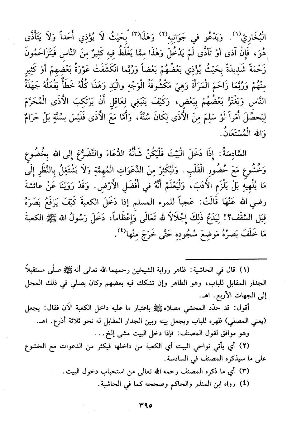 الْبُخَارِي (¬1). وَيَدْعُو في جَوَانبِهِ (¬2) وَهَذَا (¬3) بِحَيْثُ لاَ يُؤذِي أَحَداً وَلاَ يَتَأَذَّى هُوَ، فَإِنْ آذى أوْ تأذَّى لَمْ يَدْخُلْ وَهذَا مِمَّا يَغْلَطُ فِيهِ كَثِيرٌ مِنَ النَّاسِ فَيَتَزَاحَمُونَ زَحْمَةً شَدِيدَةً بِحَيْثُ يُؤْذِي بَعْضُهُمْ بَعْضاً وَرُبما انْكَشَفَتْ عَوْرَةُ بَعْضِهِمْ أوْ كَثِيرٍ مِنْهُمْ وَرُبمَا زَاحَمَ الْمَرَأةَ وَهِيَ مَكْشُوفَةُ الْوَجْهِ والْيَدِ وَهَذَا كُلهُ خَطَأٌ يَفْعَلُهُ جَهَلَةُ النَّاس وَيَغْتَرُّ بَعْضُهُمْ بِبَعْضٍ، وَكَيْفَ يَنْبَغِي لِعَاقِل أَنْ يَرْتكبَ الأَذَى الْمُحَرَّمَ لِيَحصلَ أَمْراً لَوْ سَلِمَ مِنَ الأَذَى لِكَانَ سُنَّة، وَأَمَّا مَعَ الأَذَى فَلَيْسَ بسُنَّةٍ بَلْ حَرَامٌ وَالله الْمُسْتَعَانُ.