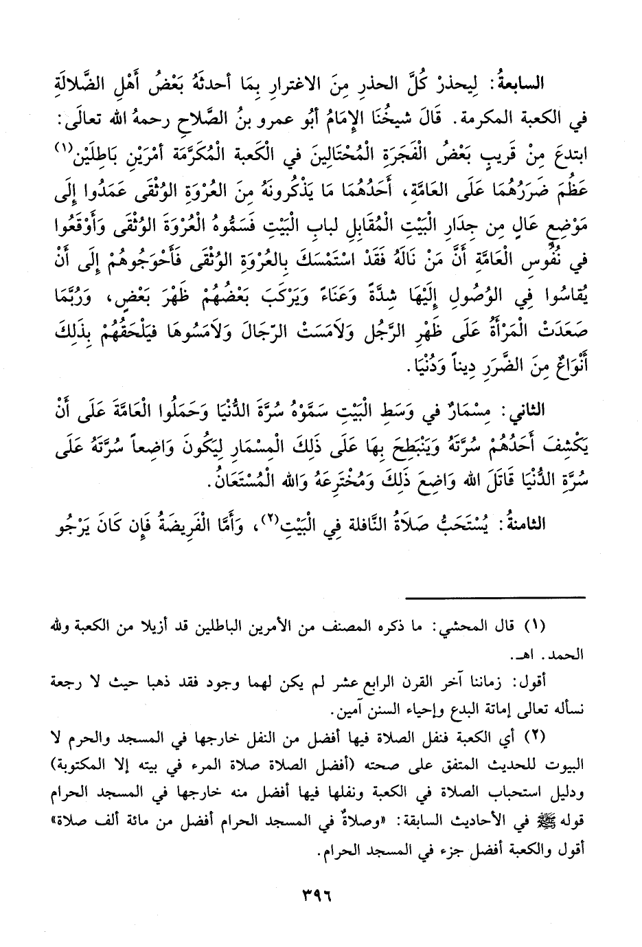 السابعةُ: لِيحذرْ كُل الحذرِ مِنَ الاغترارِ بِمَا أحدثَهُ بَعْضُ أَهْلِ الضلالَةِ في الكعبة المكرمة. قَالَ شيخُنَا الإِمَامُ أبُو عمرو بنُ الصَّلاحِ رحمهُ الله تعالَى: ابتدع مِنْ قَريبٍ بَعْضُ الْفَجَرَةِ الْمُحْتَالِينَ في الْكَعبة الْمُكَرَّمَة أمْرَيْنِ بَاطِلَيْن (¬1) عَظُمَ ضَرَرُهُمَا عَلَى العَامَّةِ، أَحَدُهمَا مَا يَذْكُرونَهُ مِنَ العُرْوَةِ الوُثْقَى عَمَدُوا إِلَى مَوْضِع عَالٍ مِن جِدَارِ الْبَيْتِ الْمُقَابِلِ لبابِ الْبَيْتِ فَسَمُّوهُ الْعُرْوَةَ الوُثْقَى وَأَوْقَعُوا في نُفوسِ الْعَامَّةِ أَن مَنْ نَالَهُ فَقَدْ اسْتَمْسَكَ بِالعُرْوَةِ الوُثْقَى فَأَحْوَجُوهُمْ إِلَى أَنْ يُقاسُوا فِي الوُصُولِ إِلَيْهَا شِدة وَعَنَاءً وَيَرْكَبَ بَعْضُهُمْ ظَهْرَ بَعْضٍ، وَرُبمَا صَعَدَتْ الْمَرْأة عَلَى ظَهْرِ الرَّجُل وَلاَمَسَتْ الرّجَالَ وَلاَمَسُوهَا فيَلْحَقُهُمْ بِذَلِكَ أَنْوَاعٌ مِنَ الضرَرِ دِيناً وَدُنْيَا.